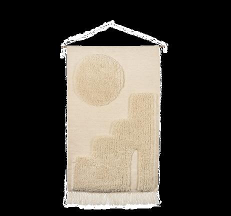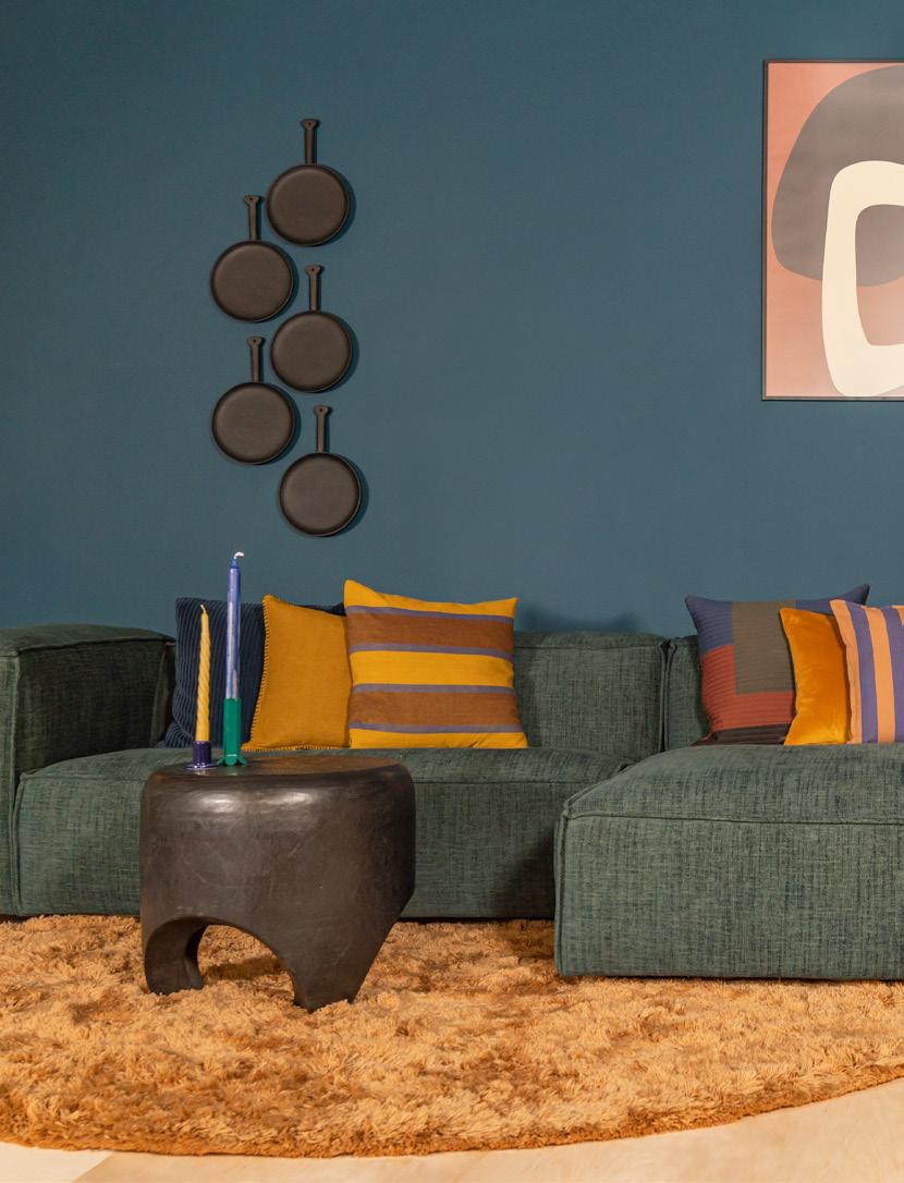 houten wanddecoratie Steelpan van Bloomingville, 41,90 sierkussen Grand van ferm LIVING, 59,- sierkussen Kyoto van OYOY, 28,- 2-zitsbank Dunbar van FEST, zoals getoond, 3508,bijzettafel, 350,- vloerkleed Lusa van Bodilson, 599,- sierkussen Knot van Design House Stockholm, 629,- dressoir Oscar van Ethnicraft, 2469,-