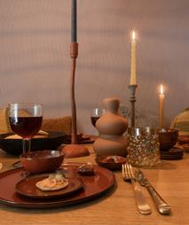 houten kandelaar van Zusss, 12,95 kandelaar van aardewerk, 19,50 dinerkaars Rustic van House Doctor, 13,49 (set van 8) kaarsenstandaard Fountain van Urban Nature Culture, 14,95 houten eettafel Madison van Gert Snel, 2150,-