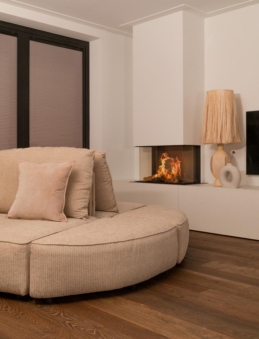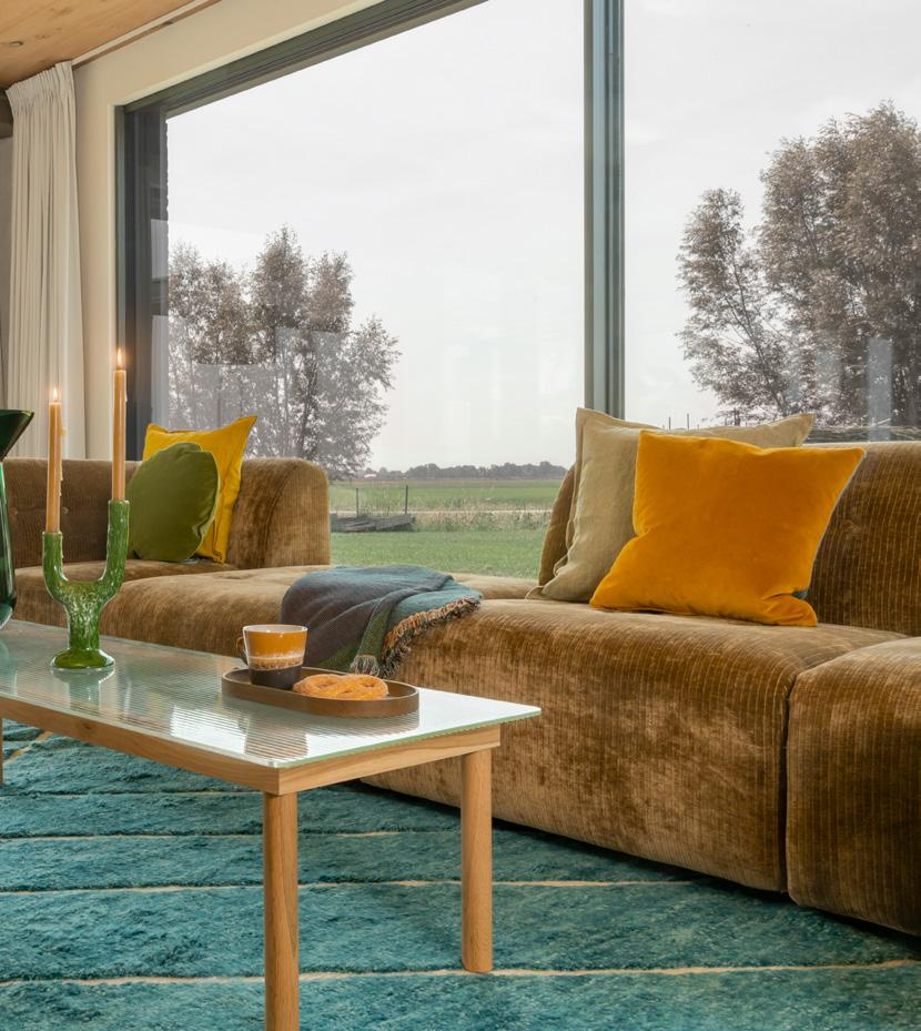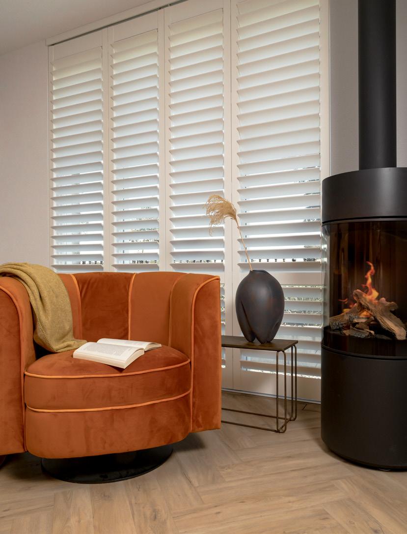 plaid Kolonial van House Doctor, 68,- draaifauteuil Flower van Zuiver, 749,- shutters van Vivante Bekenkamp, maatwerk salontafel 182 van Freistil, 582,vaas Sumo Slim van 101 Copenhagen, 129,- eikenhouten vloer Bertus Smit van Hollandsche Vloeren, gelegd in Hongaarse punt, 129,95 per m2