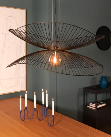 Een speelse, maar ook sierlijke hanglamp ontworpen door Élise Fouin. De op elkaar geplaatste golvende frames rond het lichtpunt weerspiegelen de liefde van de ontwerpster voor de natuur. Tegelijkertijd stralen de frames ook moderniteit uit, door de strakke uitvoering in metaal en door het grafische patroon die verkregen wordt door de lijnen van de draadstructuur. Prijs 590,-