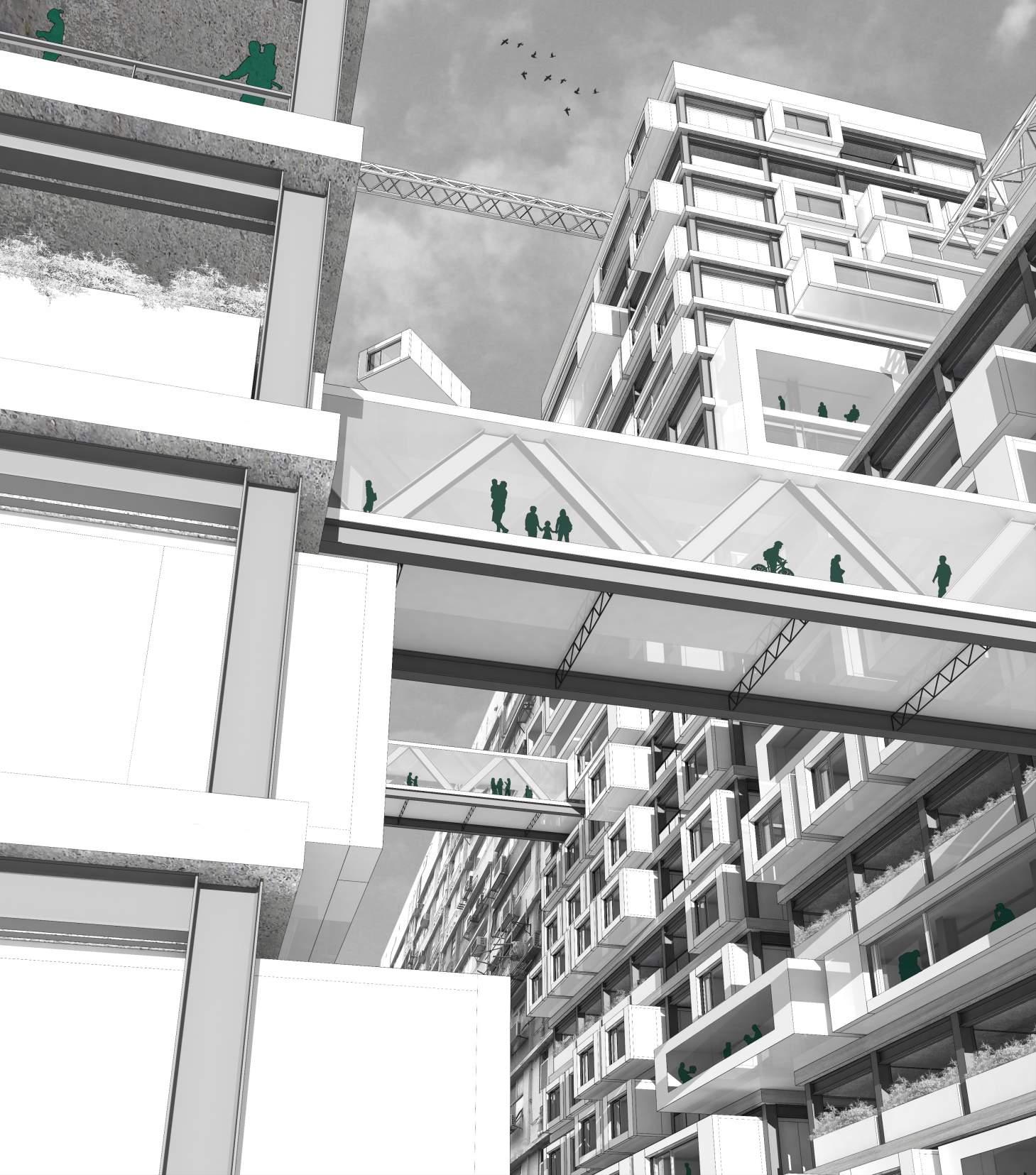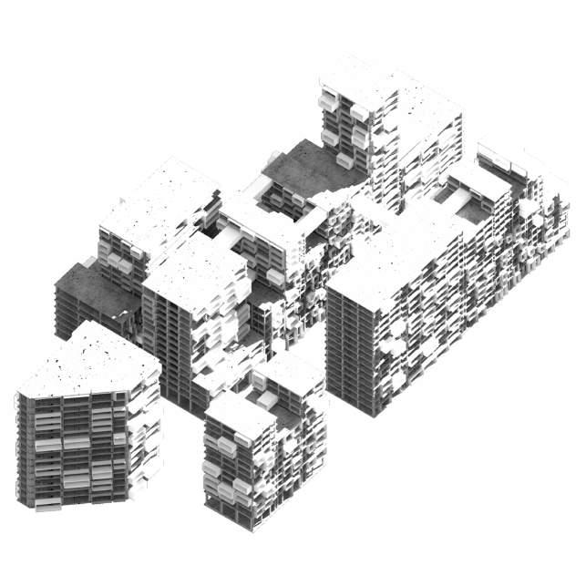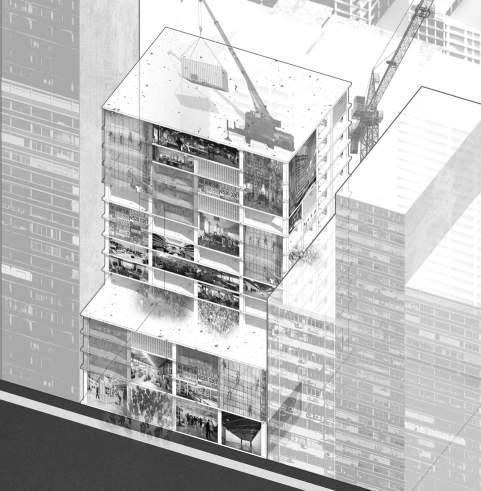 URBAN INTERVENTION. MODULAR UNITS THAT VARY IN DIMENSION AND PROGRAM WILL GET FURTHER DEVELOPED WITH SPECIFICITY INTO PREFABRICATED UNITS THAT ARE FLEXIBLE, MODIFIABLE, MOBILE AND RECONFIGURABLE. EACH UNIT WITH ITS OWN UNIQUE CHARACTERISTICS WILL START TO OCCUPY VACANT STRUCTURES, GIVING THEM THE “SECOND LIFE”. MODULAR UNITS ARE THUS THEORETICALLY ADJUSTABLE TO ANY CONFIGURA