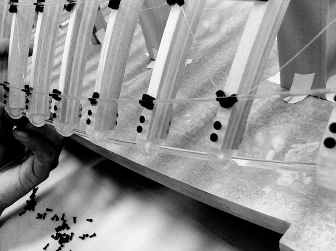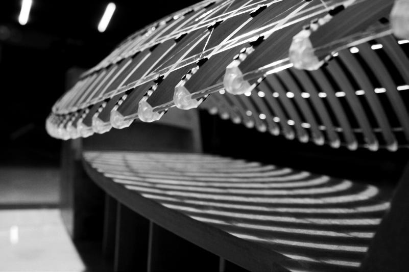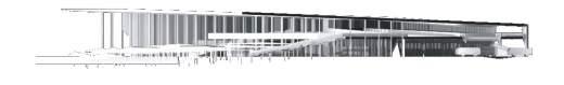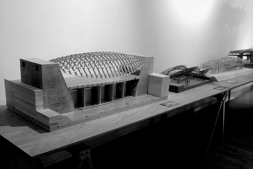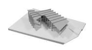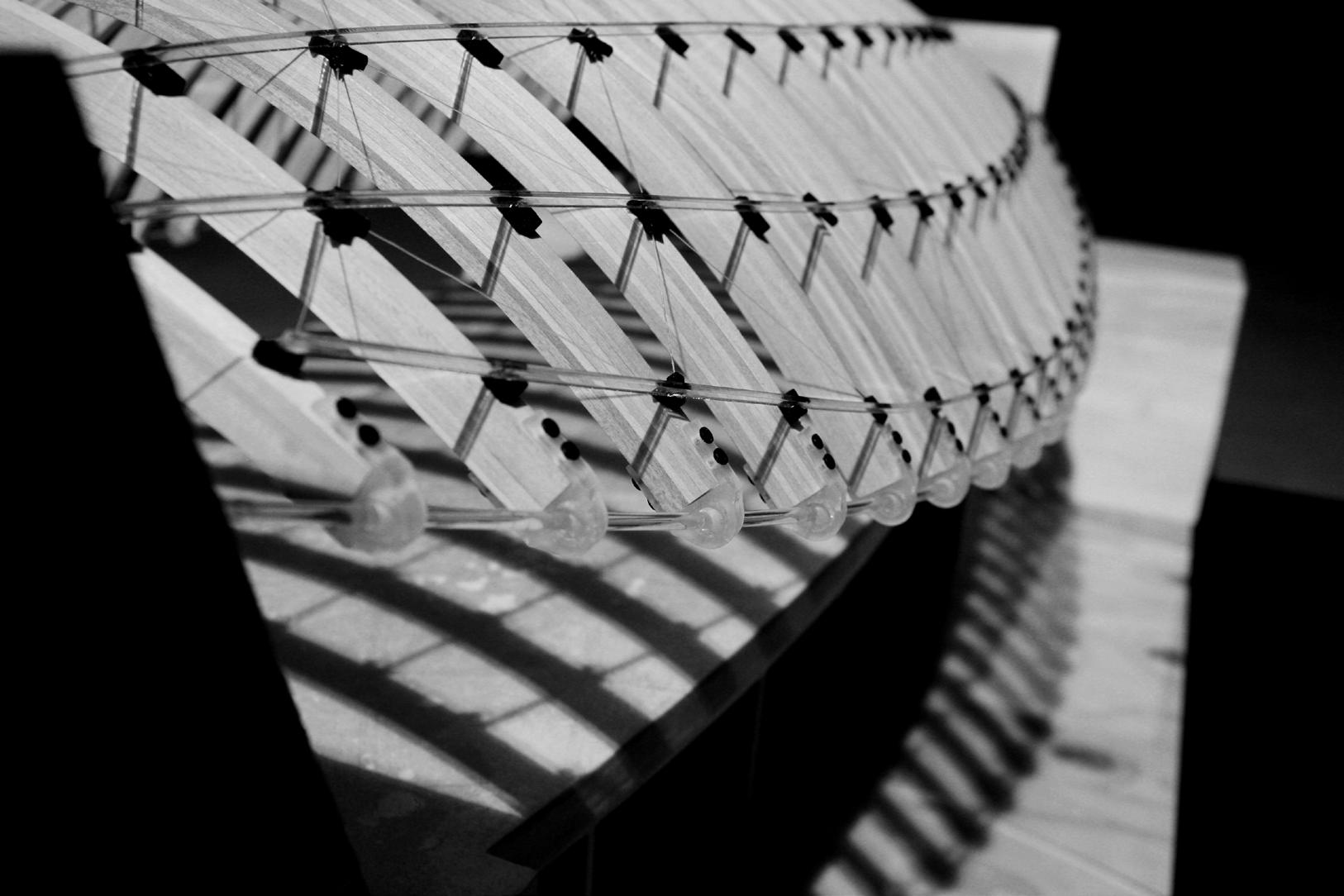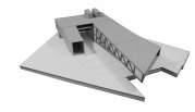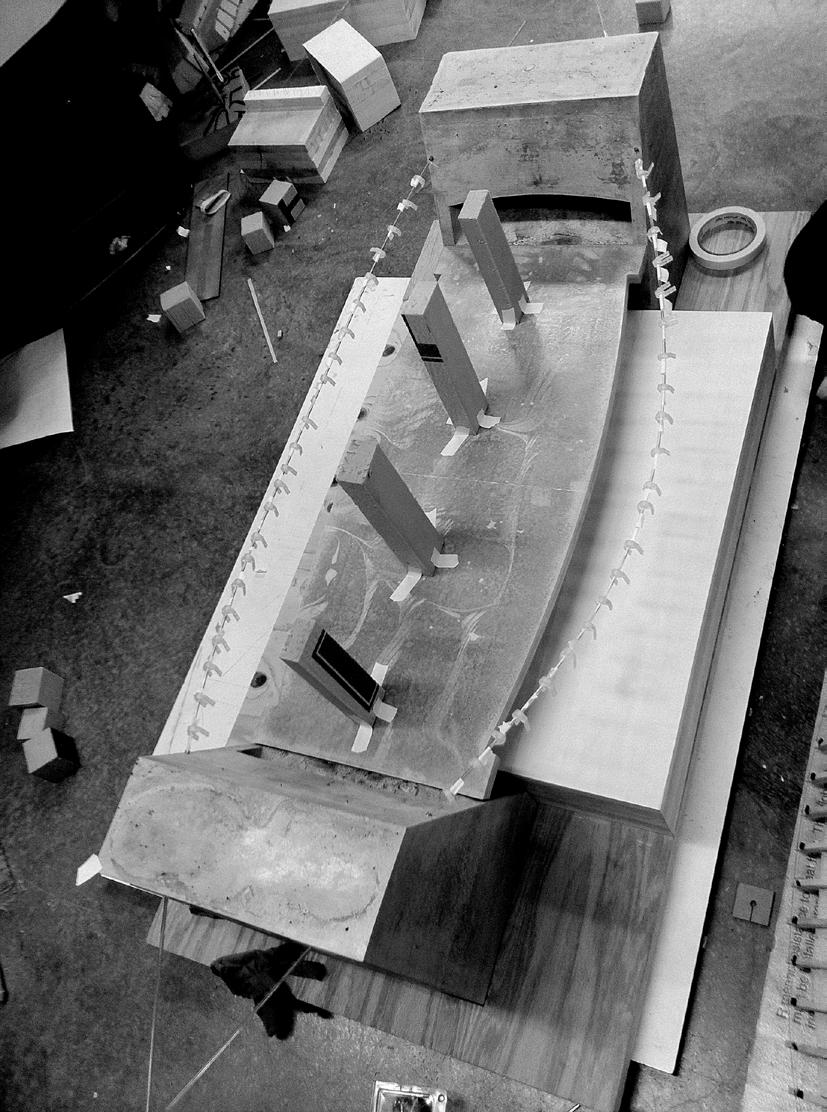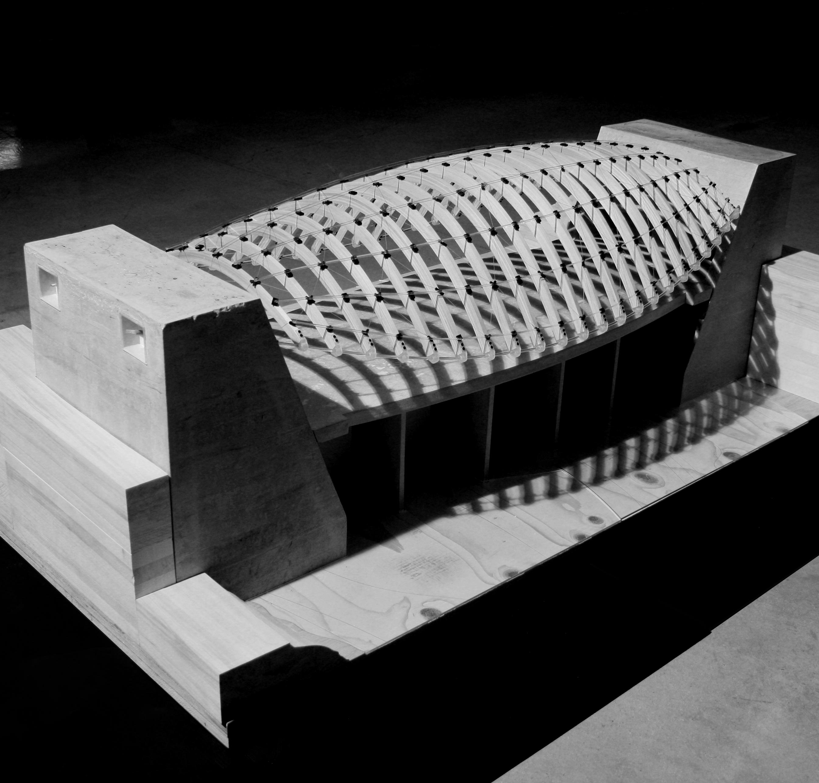 TWO LOAD BEARING SUSPENSION STEEL CABLES AND THE NATURAL CURVATURE THEY CREATE ARE THE PRIMARY FEATURES THAT DICTATE THE BUILDING’S UNIQUE DESIGN. SELF - SUPPORTING ROOF STRUCTURE SHELTERS THE INTERIOR SPACE, WHICH ALSO ACTS AS BRIDGE OVER ARTIFICIAL WATERFALL. CAREFUL STUDY OF THE BUILDING’S UNIQUE STRUCTURE, MATERIAL, AND ASSEMBLY WAS CARRIED OUT IN ORDER TO FULLY UNDERSTAND THE STRUCTURAL SYSTEMS OF BUILT PROJECT, FOLLOWED BY PRECISE REPRESENTATION/RECREATION OF THE ARCHITECTURE AT A MODEL SCALE.
