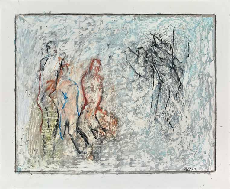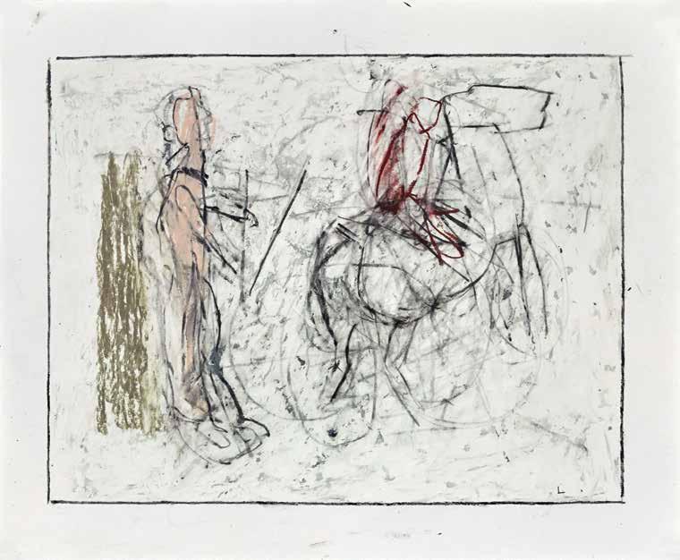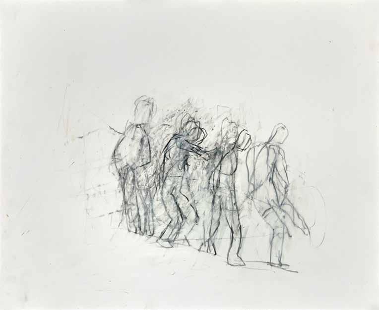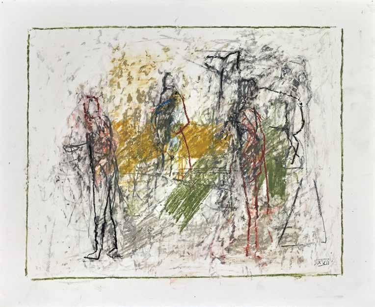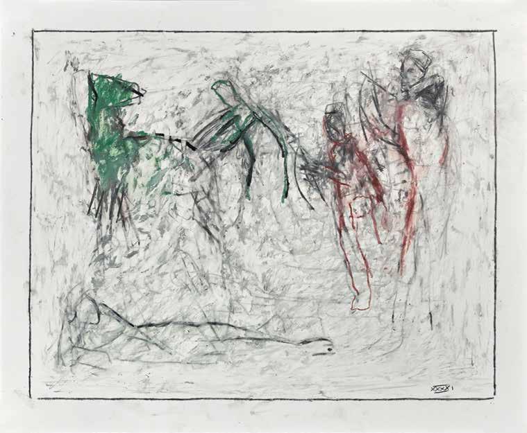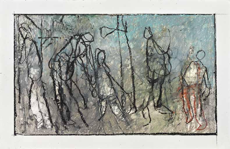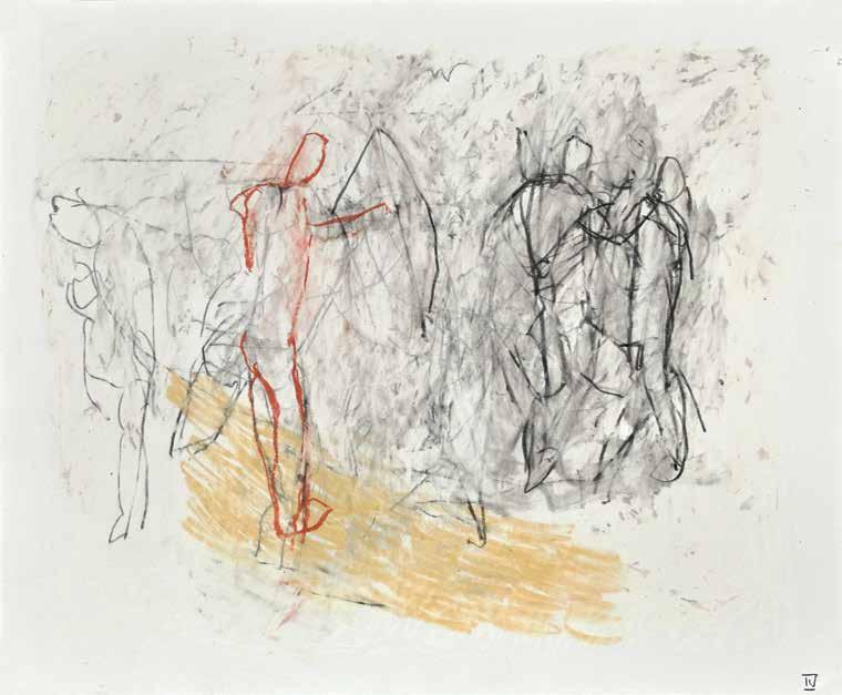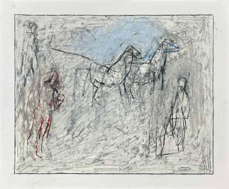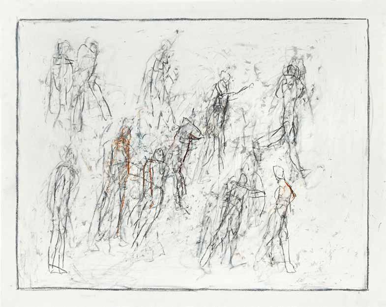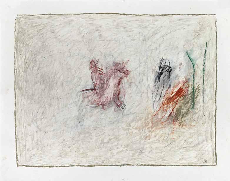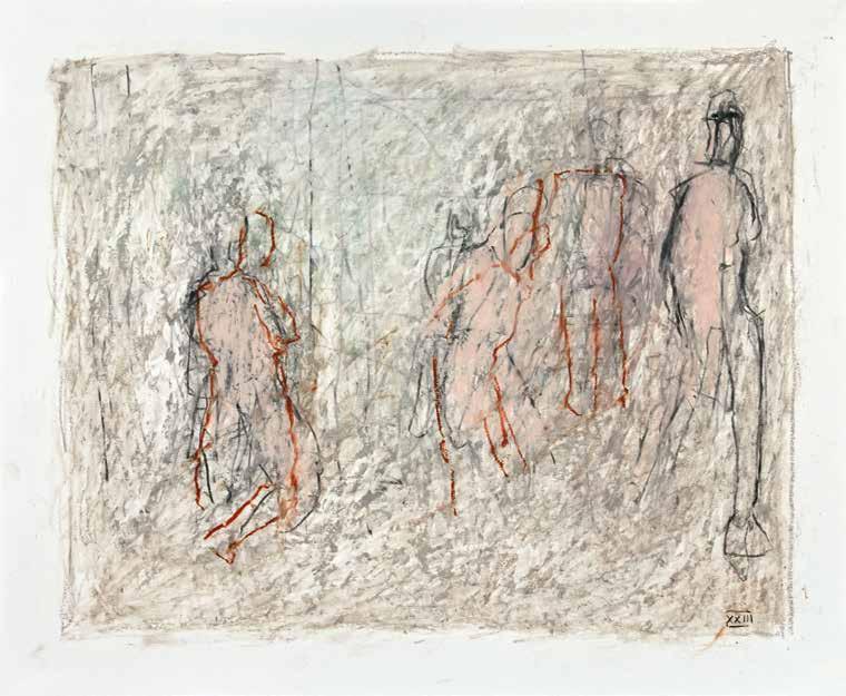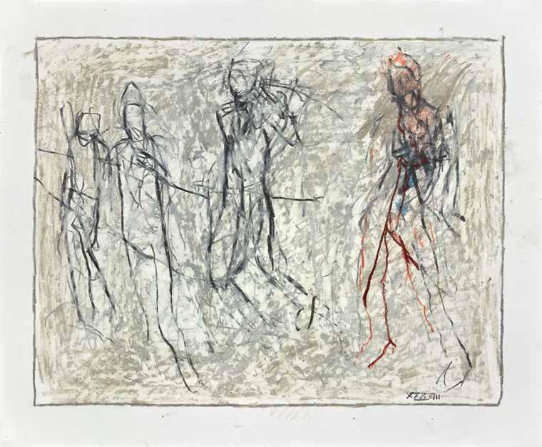of materials than either of these modern masters. We might in fact detect the stronger influence of de Kooning or Pollock in his preference for urgent nests of marks over classical intervals and lucid geometries. Delicacy and rawness of touch combine in his drawings, shaping human figures and the occasional tree or architectural element in looping, criss-crossing lines, and aerating their masses with cannily untouched regions of paper. Noble events—heroic battles, journeys, encounters—emerge with a certain abject raggedness, as if the artist were reliving, in real time, his subjects’ doubts and trials. Radell seems compelled, in short, not by the aesthetic mannerisms of the epic, but by its down-to-earth ramifications.