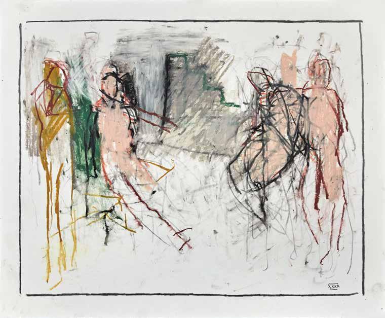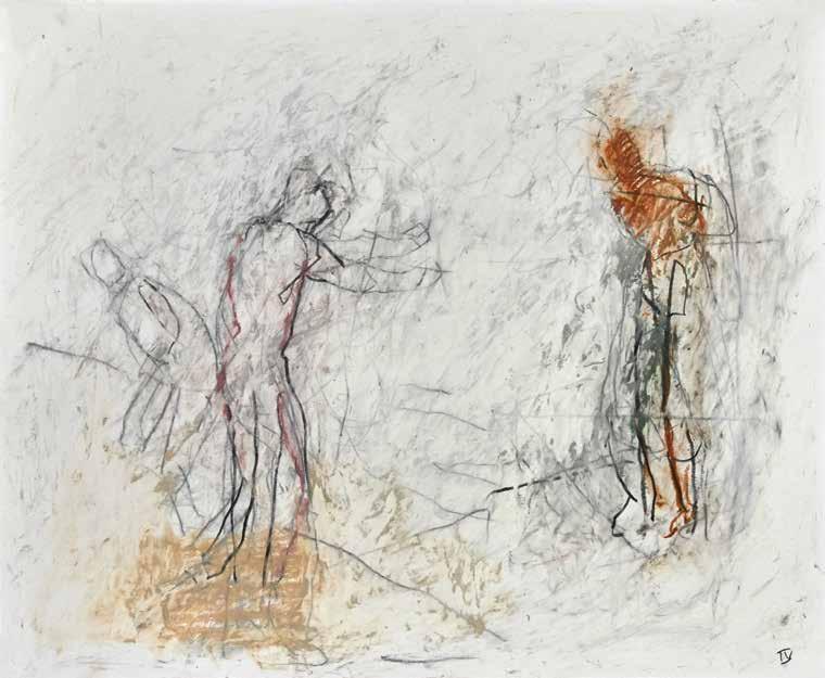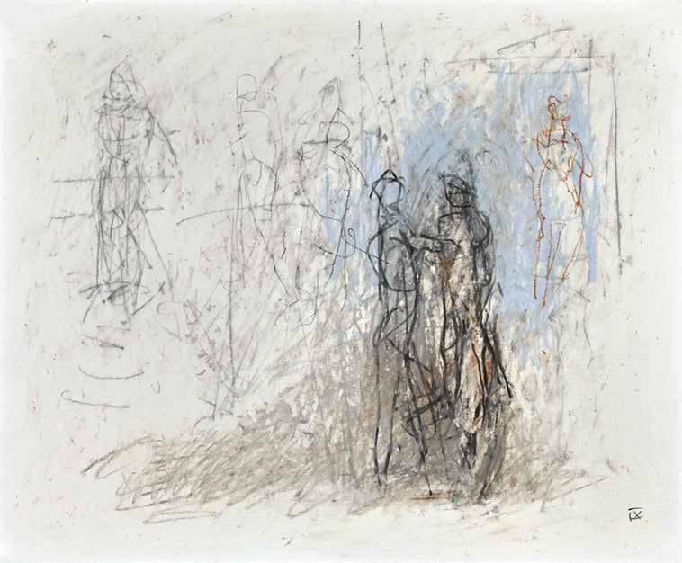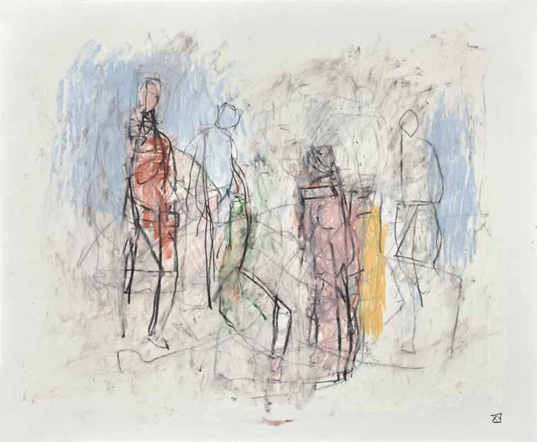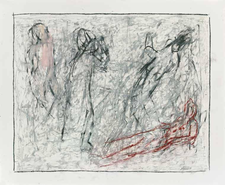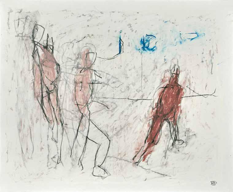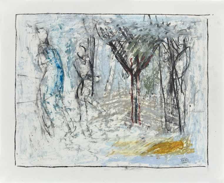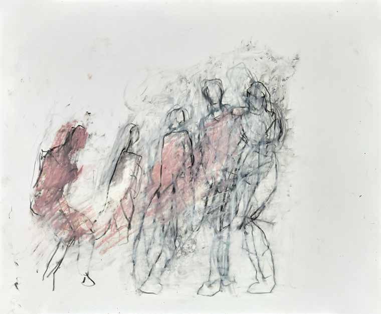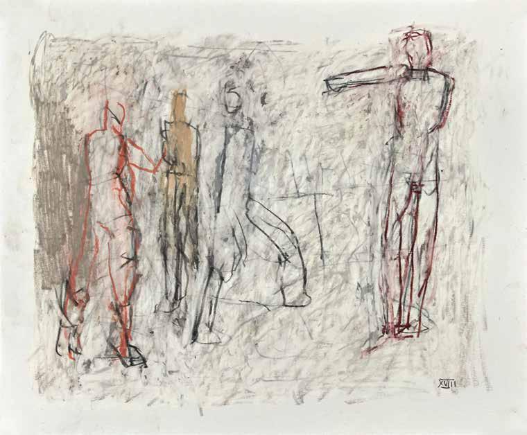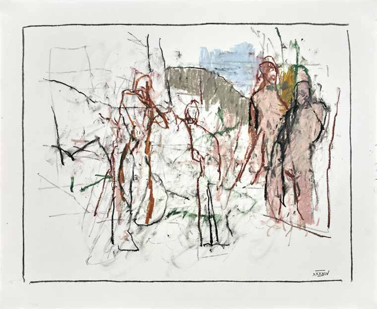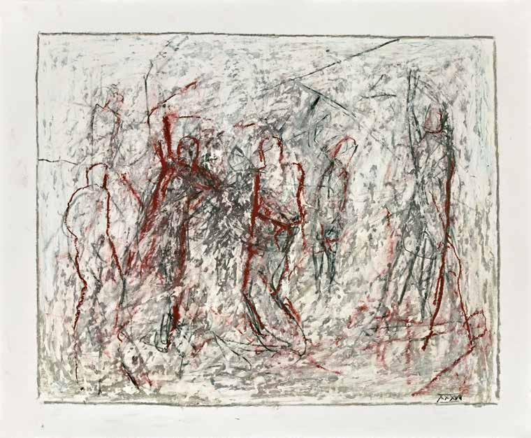 of materials than either of these modern masters. We might in fact detect the stronger influence of de Kooning or Pollock in his preference for urgent nests of marks over classical intervals and lucid geometries. Delicacy and rawness of touch combine in his drawings, shaping human figures and the occasional tree or architectural element in looping, criss-crossing lines, and aerating their masses with cannily untouched regions of paper. Noble events—heroic battles, journeys, encounters—emerge with a certain abject raggedness, as if the artist were reliving, in real time, his subjects’ doubts and trials. Radell seems compelled, in short, not by the aesthetic mannerisms of the epic, but by its down-to-earth ramifications.