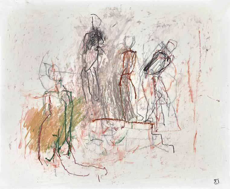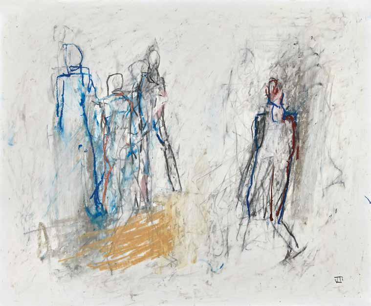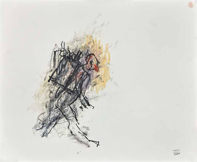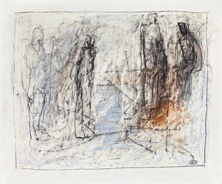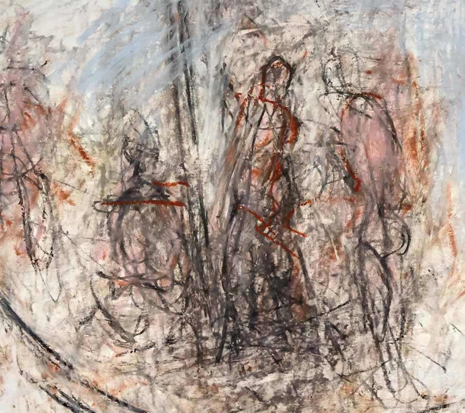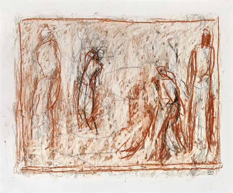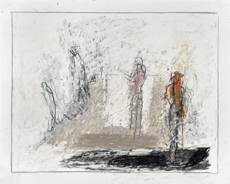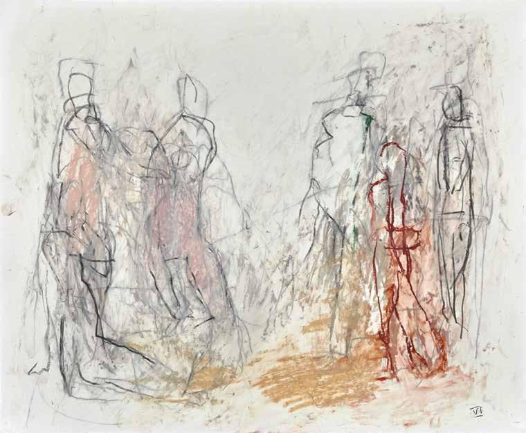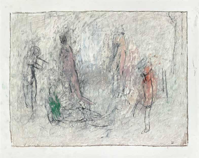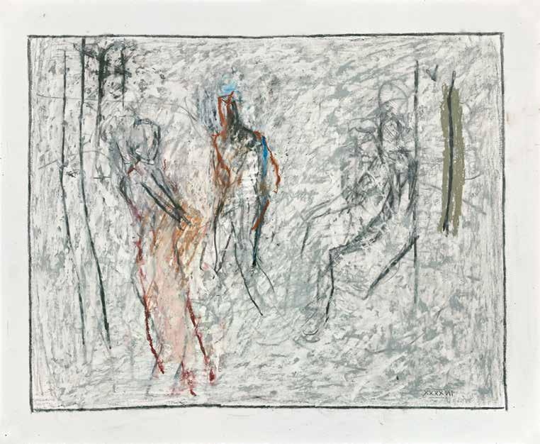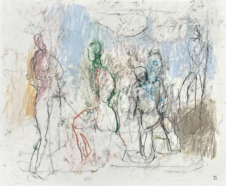 of materials than either of these modern masters. We might in fact detect the stronger influence of de Kooning or Pollock in his preference for urgent nests of marks over classical intervals and lucid geometries. Delicacy and rawness of touch combine in his drawings, shaping human figures and the occasional tree or architectural element in looping, criss-crossing lines, and aerating their masses with cannily untouched regions of paper. Noble events—heroic battles, journeys, encounters—emerge with a certain abject raggedness, as if the artist were reliving, in real time, his subjects’ doubts and trials. Radell seems compelled, in short, not by the aesthetic mannerisms of the epic, but by its down-to-earth ramifications.