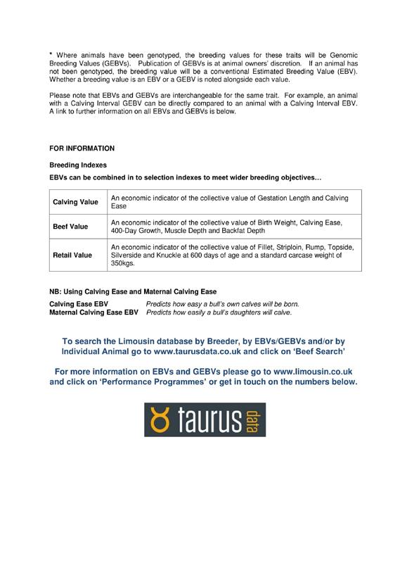 The pedigree, performance, DNA, health information and footnotes included in Society sale cat alogues is as supplied by, or on behalf of the vendor. The responsibility for the accuracy of the information therefore rests solely with the vendor and not with the British Limousin Cattle Society Ltd (BLCS). It should be noted that the Estimated Breeding Values for all animals change over time, as new performance records come available. While the BLCS and Genesure Ltd seek to ensure that the information contained in catalogues is accurate at the time of printing in accord ance with their terms and conditions, no warranty is given in respect thereof by the BLCS and, to the maximum extent permitted by law, the BLCS shall have no liability for any loss, damage or injury howsoever caused (including that caused by negligence) or suffered directly or indirectly in relation to information and opinions contained in or omitted from this publication. Genesure Ltd’s liability is limited to the extent set out in its terms and conditions (a copy is available from the BLCS office upon request).