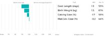 ✓ Equally, bars that lie to the left of the line indicate EBVs/GEBVs that are below Breed Average. The further to the left they are, the further below Breed Average they are.