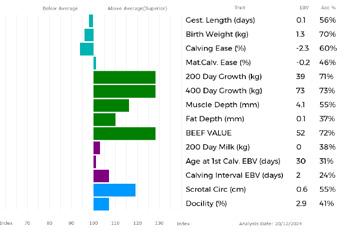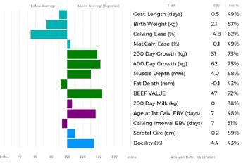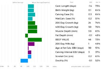 ✓ Equally, bars that lie to the left of the line indicate EBVs/GEBVs that are below Breed Average. The further to the left they are, the further below Breed Average they are.