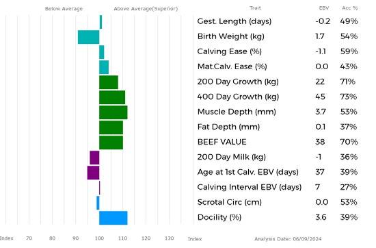 EBVs & GEBVs are expressed in the same unit as the recorded trait (eg kgs for 400 Day Weight, mm for Muscle Depth etc) are relative to the Breed Average.