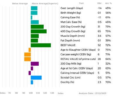 EBVs & GEBVs are expressed in the same unit as the recorded trait (eg kgs for 400 Day Weight, mm for Muscle Depth etc) are relative to the Breed Average.
