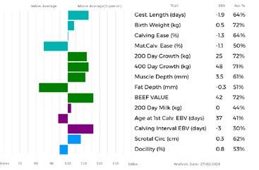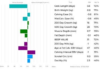✓ Equally, bars that lie to the left of the line indicate EBVs/GEBVs that are below Breed Average. The further to the left they are, the further below Breed Average they are.