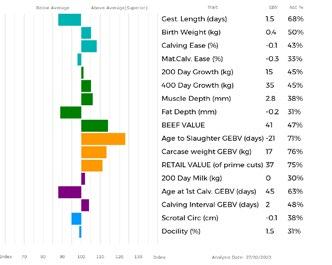 ✓ Equally, bars that lie to the left of the line indicate EBVs/GEBVs that are below Breed Average. The further to the left they are, the further below Breed Average they are.