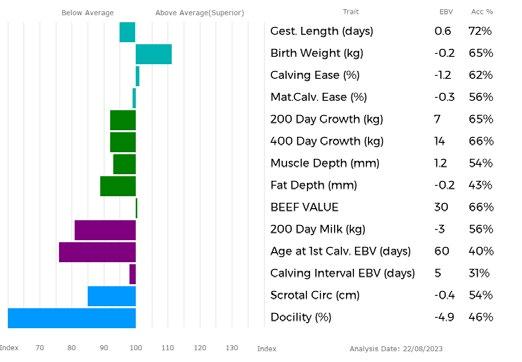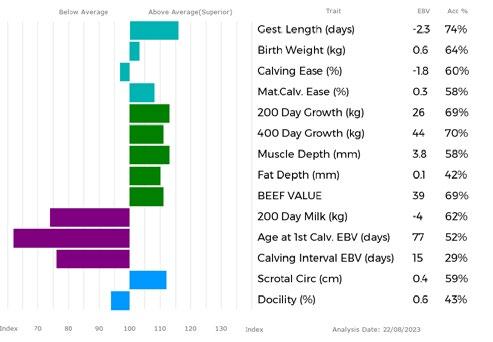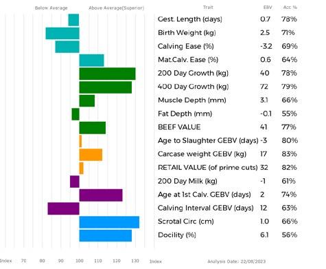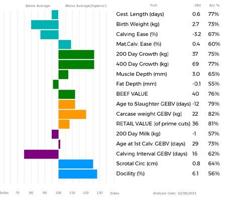 ✓ Bars that lie to the right of that line indicate EBVs/GEBVs that are above average. The further to the right they lie, the higher above Breed Average they are.