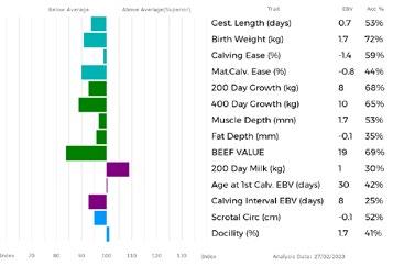 ✓ Bars that lie to the right of that line indicate EBVs/GEBVs that are above average. The further to the right they lie, the higher above Breed Average they are.