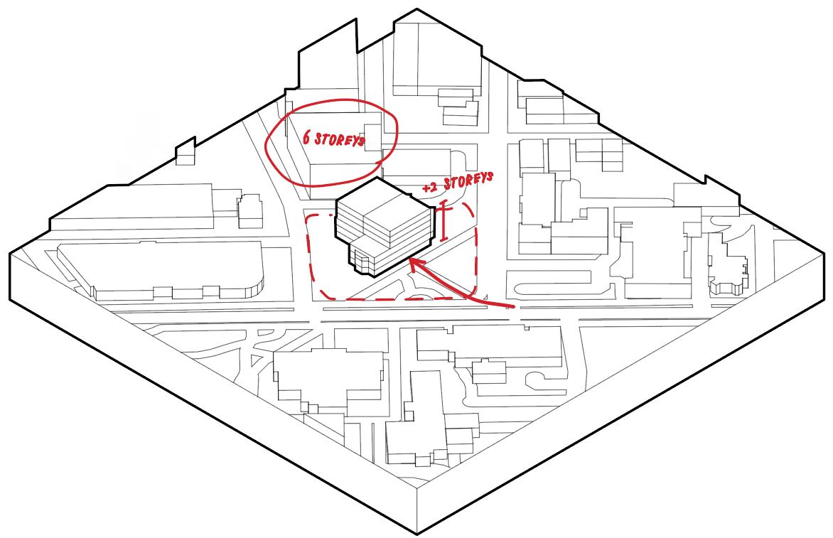 The area surrounding the library is full of mixed-use buildings which benefit from its central location. The area within a 5-minute walking radius also harbors a variety of housing and green spaces in between. Keeping this in mind, our suggestion maintains a contextually conscious height