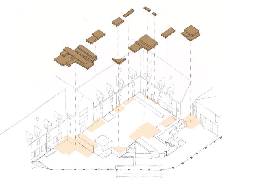 The St. Hugh’s College Junior Common Room at Oxford University is currently a haphazard space used daily by students to study and unwind between classes. Currently the space consists of a plexiglass addition, surrounded by unused brick balconies which restrict access and light into the courtyard. Through the clearing of obstructive balconies, and relocation of the common room to an under-utilized space, the courtyard can be reinhabited as a garden and outdoor patio space for a variety of activities ranging from social to independant study.