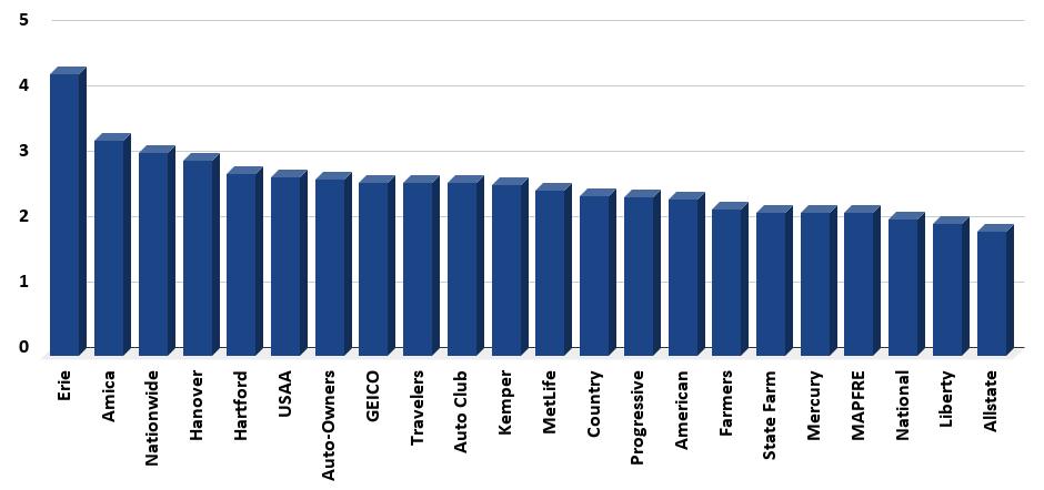 Auto-Owners Insurance Group and The Hartford, with increases of 1.25, 0.6 and 0.49 respectively. In fact, 15 of the 22 rated insurers saw decreases in their overall scores, but while Progressive’s score of 11.93 remained stagnant, the negative changes to other companies allowed them to “Flo” from the 15th to the 11th position.