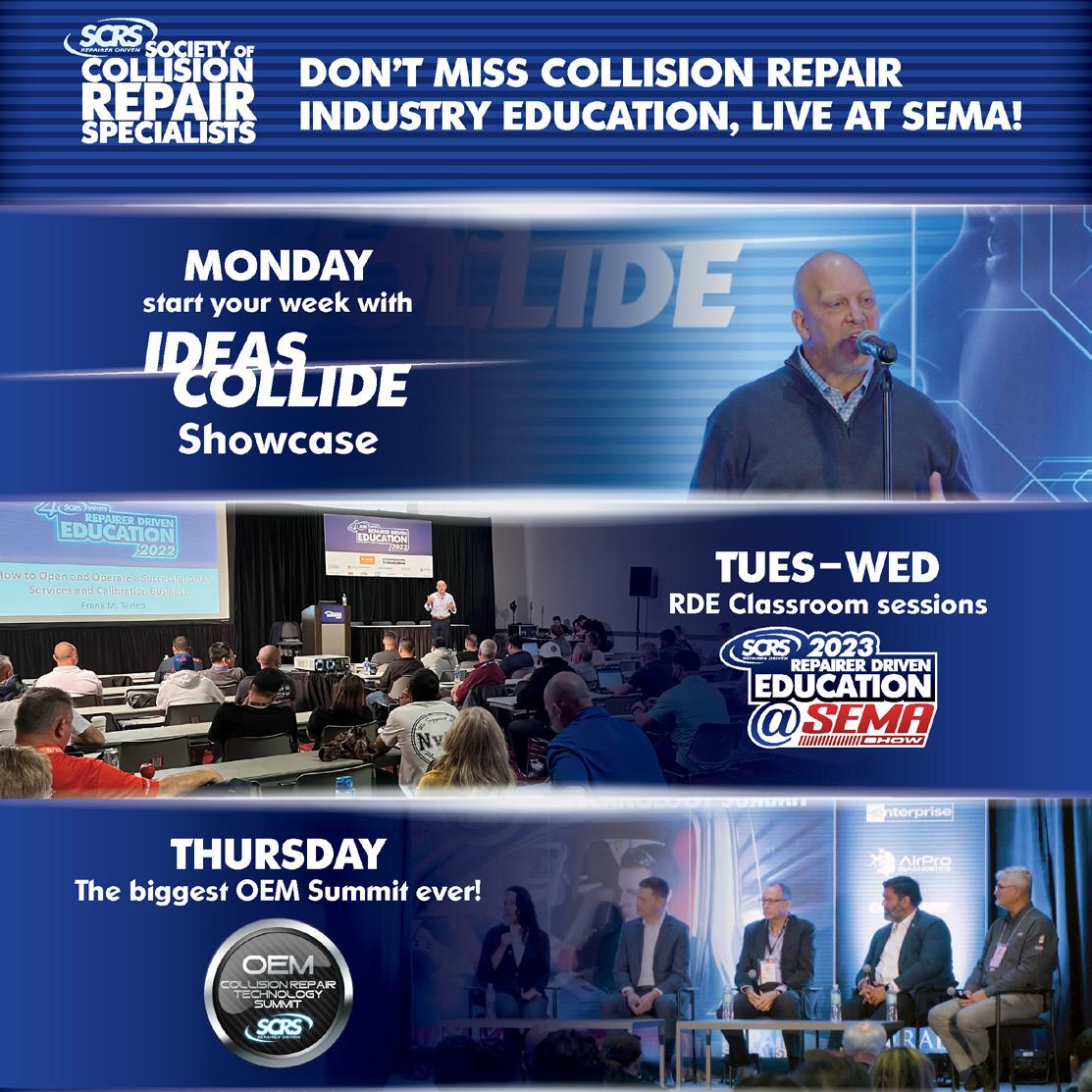 9:30am - 5pm Repairer Driven Education 9am - 2:30pm OEM Summit (Repairer Driven Education) 9pm SCRS After Party