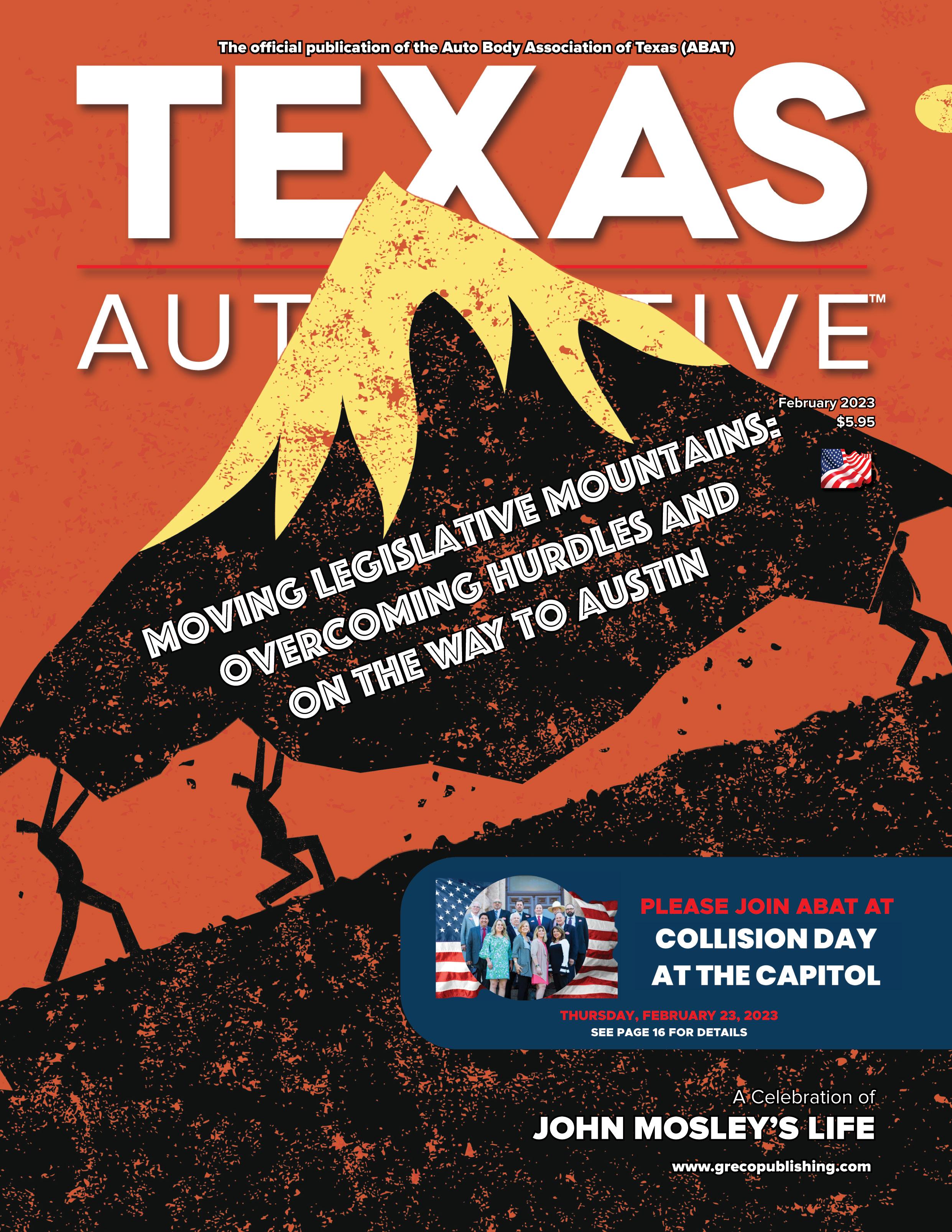 Since the last legislative session ended in 2021, ABAT has been diligently working on its plans for the 88th legislative session, which includes two vital bills designed to protect consumers and collision repair facilities alike: their Safe Repair and Fair Appraisal bills. (Get the full scoop on ABAT’s 2023 legislative agenda at grecopublishing.com/txa0123coverstory.)