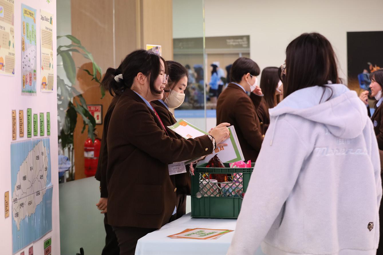 유지하고, 한국 국가교육과정에 따라 한국사 지식도 함께 쌓아야 한다고 생각합니다. 게다가 외국 국적 학생에게는 언어에 대한 관심과 애정을 발견할 수 있는 절호의 기회입니다. 그리하여 이번 주에는 ‘복도 내 영어 사용’ 규칙 대신 한국어 사용을 독려해 보는 값진 시간이었습니다! 복도 가득히 사진 전시 및 오디오북, 게임, 포토 부스, 한국 전통 부채 및 서예 체험 기회 등 볼거리, 즐길거리가 한가득한 시간이었습니다. 감탄을 자아냈던 음악 공연도 빼놓을 수 없죠!