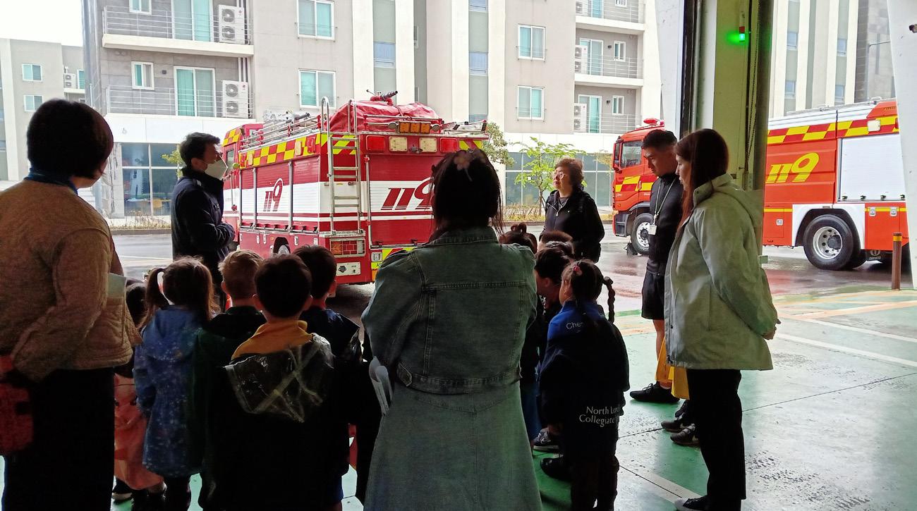 선생님과 Ms. Freeman 선생님의 설명을 덧붙이면 ‘학생들은 실제 분사 시연을 포함하여 소화기 사용법을 흥미롭게 배웠답니다! 소방차에 직접 앉아 볼 수도 있었고, 일부 용감한 학생들은 실제 소방관이 사용하는 산소 마스크도 착용해 보았습니다. 모두에게 생동감 넘치는 체험 활동이었습니다.’ More pictures.