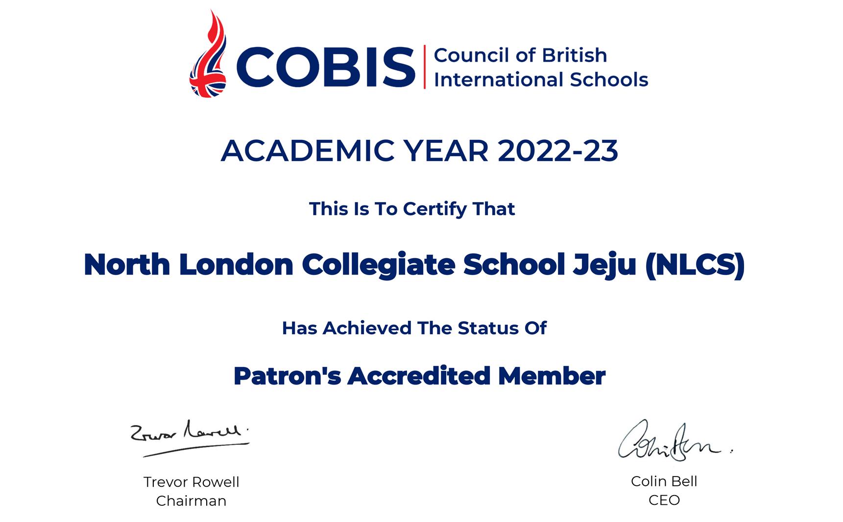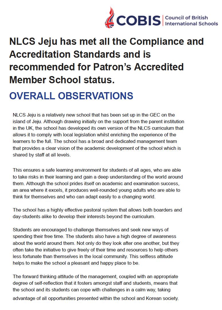 Finally we are delighted that we have gained the COBIS Patron accreditation and the report recognises the achievements and worth of our NLCS Jeju community and its exceptional British education.