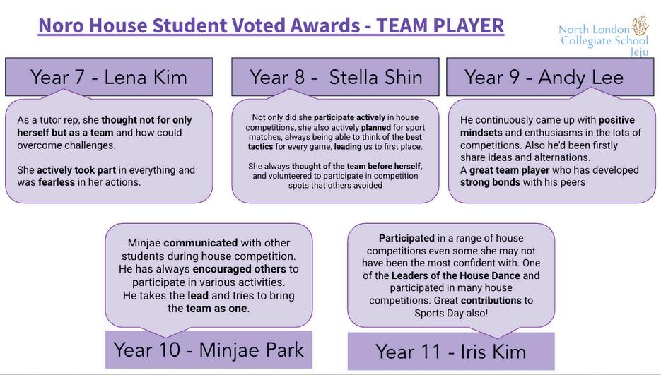 Jinhoo has shown great commitment and enthusiasm for the house throughout the year. Jinhoo is friendly, social, and approachable, building strong connections with peers across year groups and contributing to a positive and inclusive atmosphere within the house His cheerful personality and can-do attitude make him a joy to work with, and he consistently brings energy and motivation to every activity Whether it's sports, arts, service events, or team-based challenges, Jinhoo engages wholeheartedly and sets a positive example for others His willingness to help, excellent teamwork, and genuine enthusiasm have made him a truly valued and much-loved member of the Noro community.