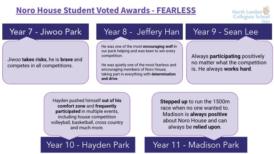 Thank you for six wonderful years as a member of the Noro Wolf Pack During my time at NLCS Jeju I have been fortunate enough to have been the Noro Housemistress in h Boarding Homes and Head of Noro House. It has been an incredible journey of ma highs and times where we have had to dig deep, be resilient and grow stronger. One my first memories of Noro House and the power of the wolf pack was in October 2 during the House Singing where Noro achieved 1 place singing ‘This Is Me’ T atmosphere in the PAC was incredible, and its an atmosphere which I have felt ma times since Noro House is a family, we are one, each wolf is integral to our success T Strength of the Pack is the Wolf and the Strength of the Wolf is the Pack. This yea house competition reflects our resilience, teamwork and fearlessness to climb back fr 5 position to 3 Congratulations to each and everyone of you st th rd