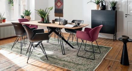 01 Tisch RAUM.FREUNDE Erik mit luftigem Steel-Twis ter-Gestell schwarz Stahl pulverbeschichtet, Platte Ei che massiv mit Schweizer Kante BHT ca. 200x76x100 cm, 2649,- 02 Stuhl RAUM.FREUNDE Yanis, Altrosa Stoff, Gestell Anthrazit, Metall, lackiert ab 325.- 03 Stuhl RAUM.FREUNDE Yanis, Sitz Stoff Eukalyptus, Rücken Stoff Microfaser Anthrazit, Gestell Anthrazit, Metall, lackiert ab 339.-