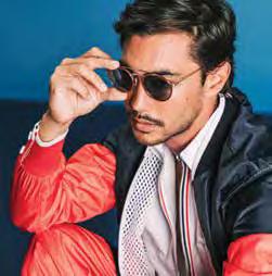 BARTON PERREIRA FINN GLASSES, $350, MEDALLION SILK TIE, $96, MEDALLION COTTON SHIRT, $198, CHECKERED SPORT COAT, $599, ALL FROM SAKS FIFTH AVENUE
