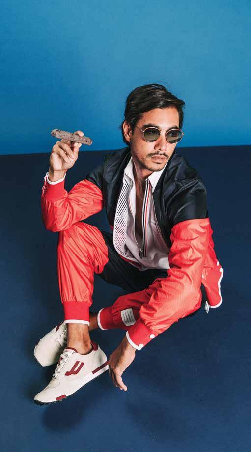 THOM BROWNE ZIP POLO, $450, THOM BROWNE BICOLOR BOMBER JACKET, $1,150, THOM BROWNE BICOLOR SWEATPANTS, $950, BALLY GAVINO RUNNER, $375, ALL FROM SAKS FIFTH AVENUE