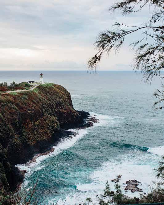 The north shore of Kauaʻi is at the top of every outdoor fanatic’s must-see list, as it serves as the jumping off point of the legendary Nā Pali coastline. Miles of velvety green peaks and valleys, folded as tightly as an accordion, wrap around the northwestern corner of the island and plunge directly into the ocean, leaving the famous Kālālau Valley accessible only by hike or boat. Where the road ends at Keʻe Beach, just after Hāʻena, the Kālālau Trail starts. The 22-mileroundtrip hike is arduous and takes planning—you must factor in camping, supplies, permits, dangerous conditions, and weather—and is not for the amateur hiker.