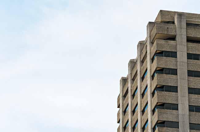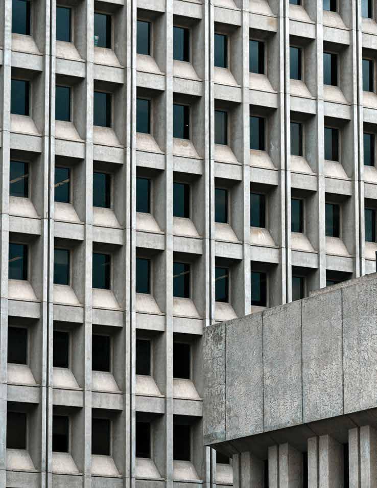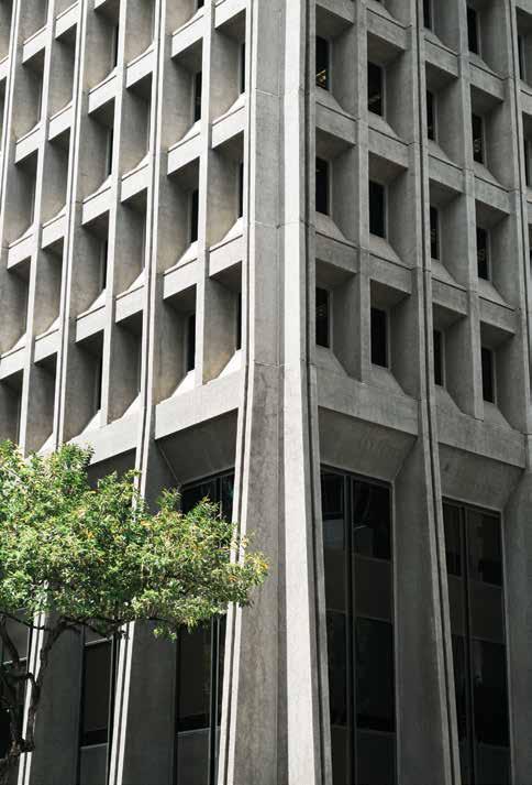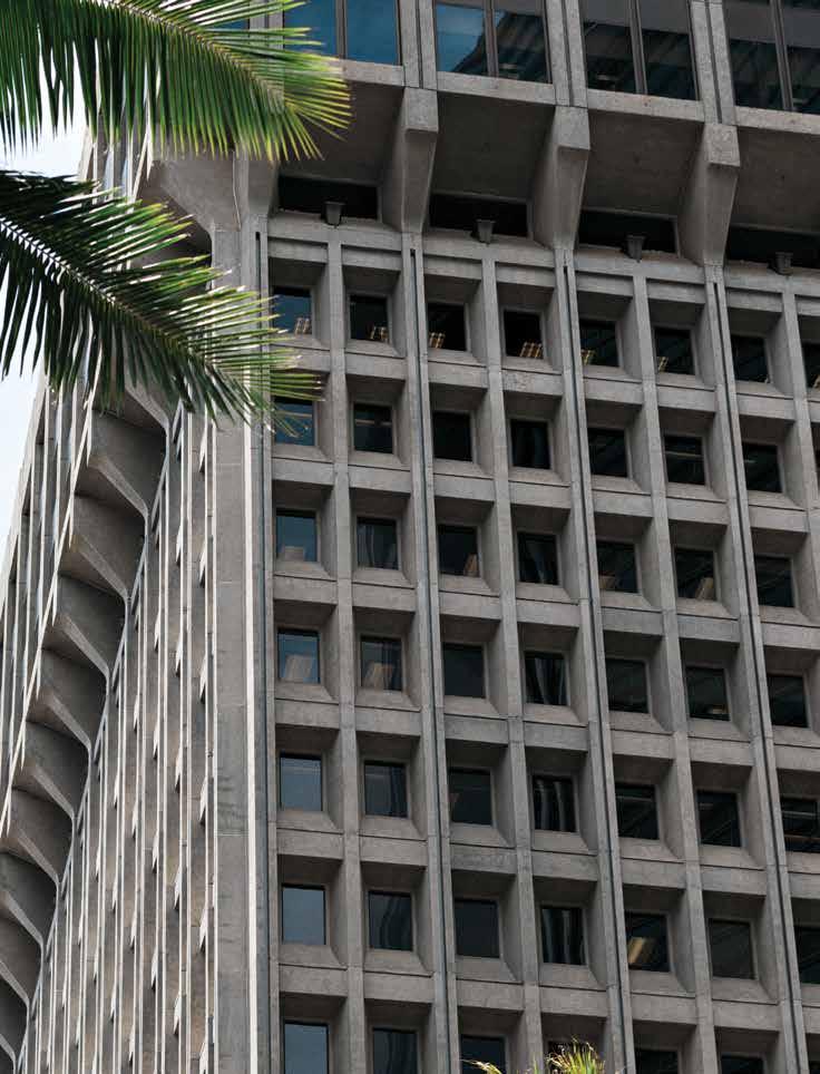 Brutalist architects chose concrete as their material of choice because of its economics, as well as the fact that it could readily be made in the islands. Shown above, detail of American Savings Bank Tower; right, the Mililani Building, which won a design award from the Hawai‘i chapter of the American Institute of Architects in 1982.