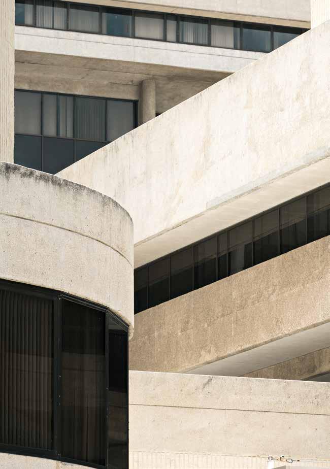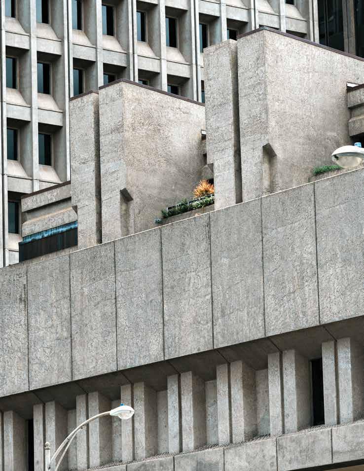 to allow them to be erased from public memory, just like generations of buildings before them. Chris Grimley, one of the authors of Heroic , recently mounted an exhibition titled Concrete Demolition at Boston’s Pinkcomma Gallery to highlight the destruction of this once-utopian architecture. In Hawaiʻi, Ward Plaza, a lowrise Brutalist office building at Ala Moana Boulevard and Ward Avenue, is actively being dismantled.