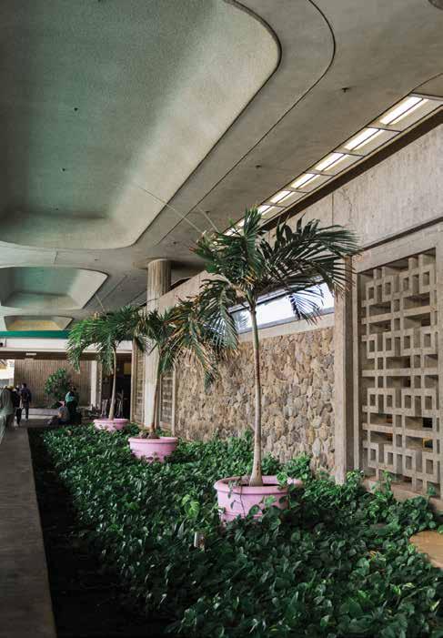 No architectural style thrown into the utterly unique milieu of Hawaiʻi emerges unchanged. Soon Brutalism was metabolized into a more acceptable and appealing island aesthetic. Still wooed by concrete, architects found ways to soften their buildings to better fit Hawai‘i’s climate and culture. They ringed their buildings with coconut palms and hala trees, incorporated lava rock, and added concrete murals.