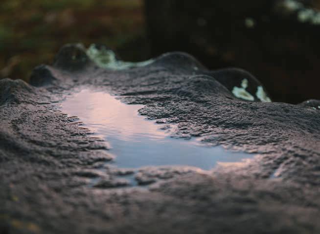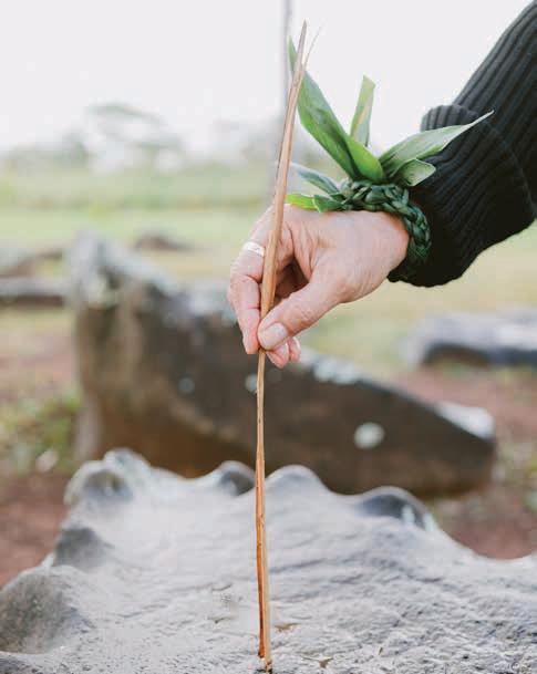 When the equinox sun sets over Mount Ka‘ala in the Wai‘anae range, it aligns with the birthstone at Kūkaniloko, where mothers gave birth. The lineal descendants told Noyes that every stone had a meaning, though what they meant was not remembered, and shared the story of a birth when a star cast a dagger-like shadow. Which rock and where the shadow fell was still known. Using astronomy software, Noyes fgured out it was the star Regulus. “It made sense,” she says, “because it’s a king maker,” referring to other cultures that also connect the star with kingship.