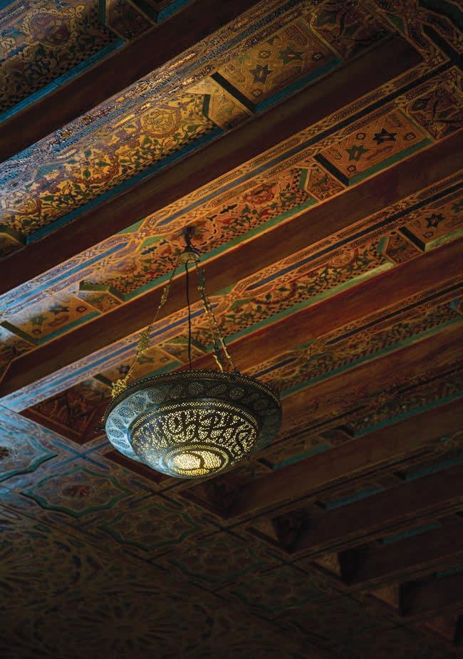 And what of the mosques and storefronts in Morocco? Many bear the same scars as those relics now in Hawai‘i. Both are haunted by the sudden stillness of quarantine. Maybe, in the quietude, they can hear each other. Some of the same items found in Shangri La, like the 17th-century decorative tiles that line the walls and foor, painted bowls and hand-carved tables, and a small Quran encased in glass, are kept in better shape in their homeland because they are used. Others fall apart for the same reason.