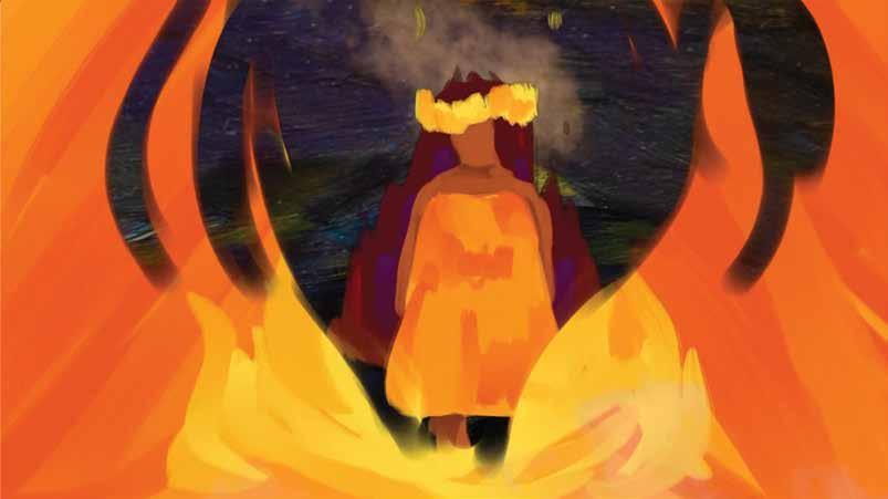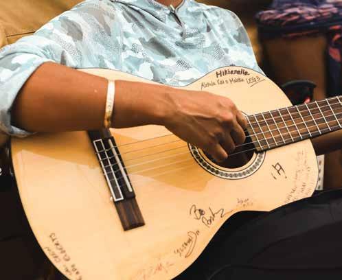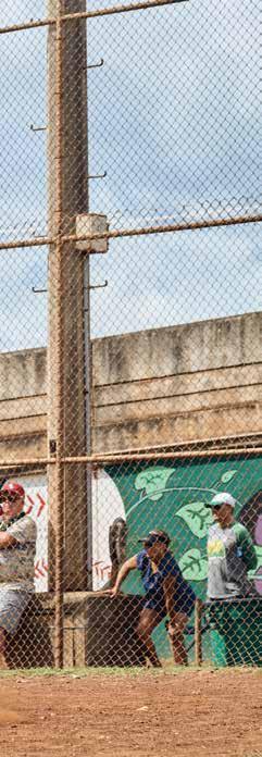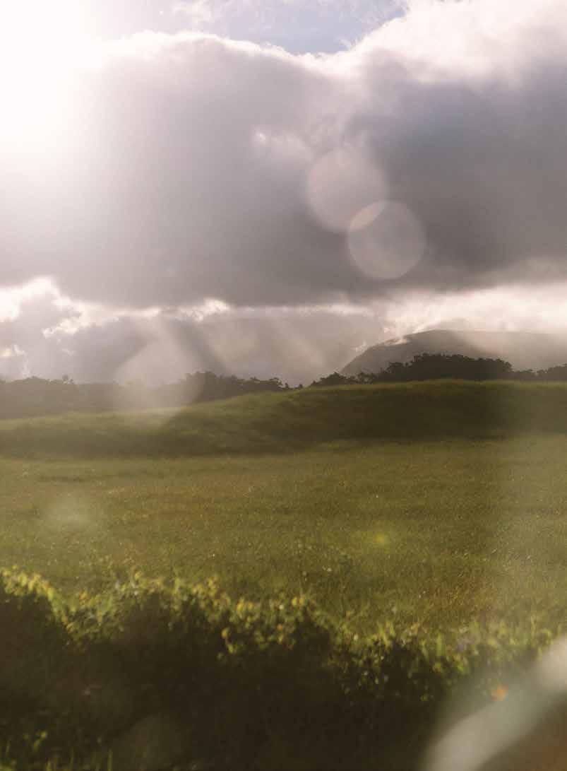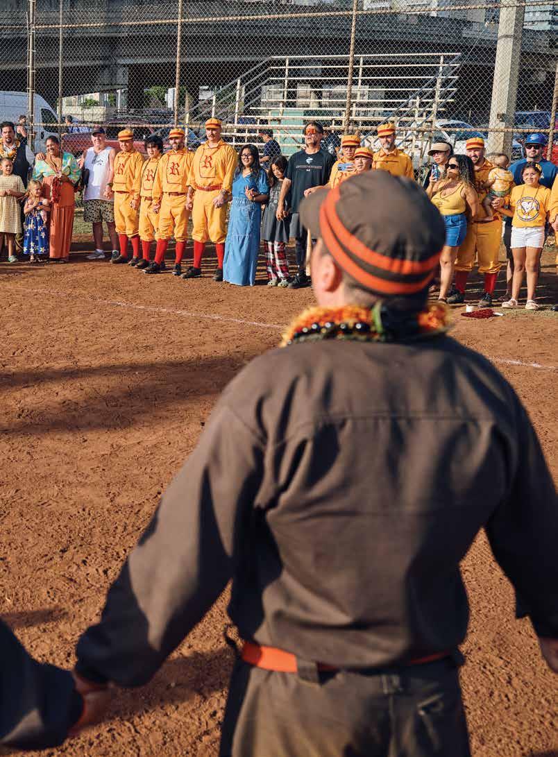 community — form a circle on the field. Kumu Anuhea Kanealiʻi leads the group in a closing oli. “When you speak ʻōlelo Hawaiʻi, you are bringing life back,” she says. “That’s what being Hawaiian is. Putting as much intention out there, hoping it’ll come back.” a