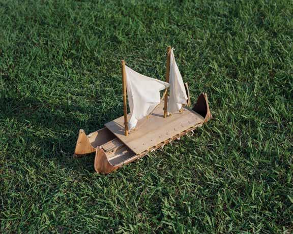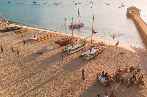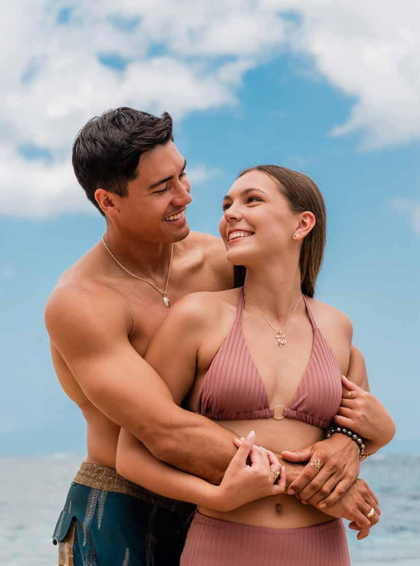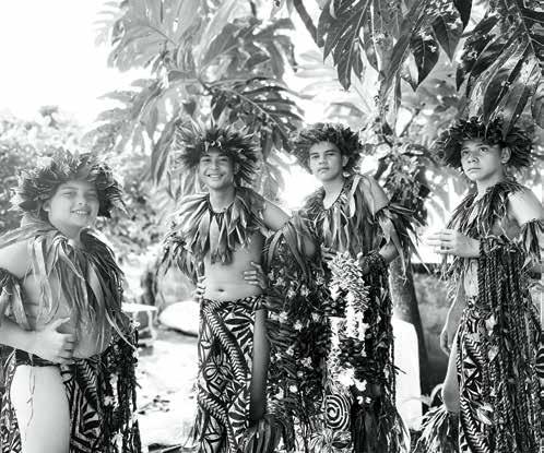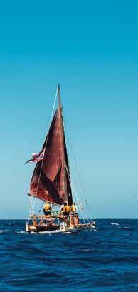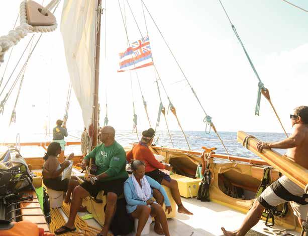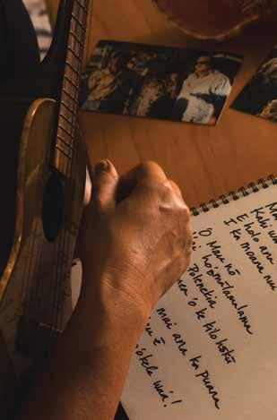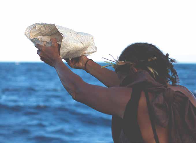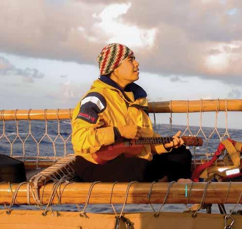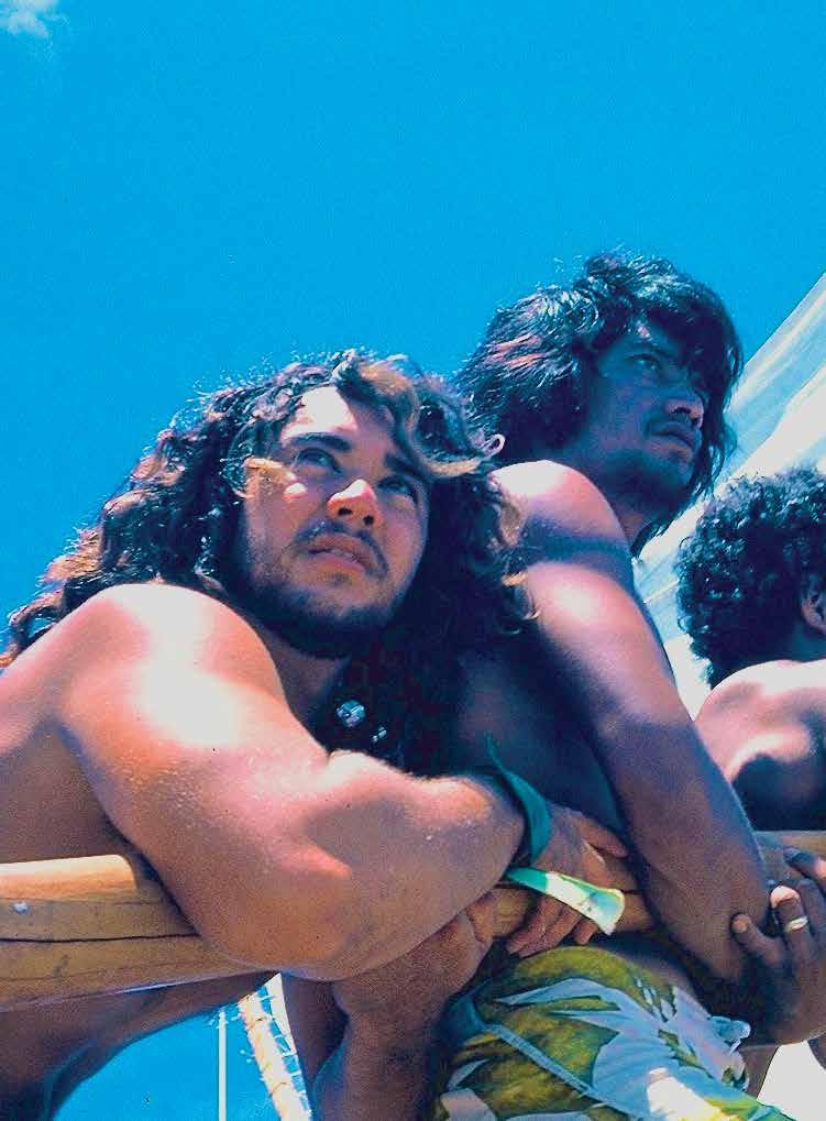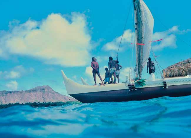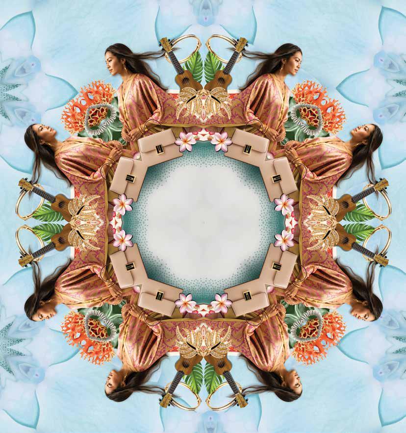 through sustainable practices. She also co-founded Waiwai Collective, a contemporary Hawaiian space for community, culture and commerce, and is creative director for the design house of Malanai. In her second contribution to Flux Hawaii, on page 72, she explores the songs of voyaging canoes and highlights the collaborative project Manuihu, a small hui of wa‘a crew dedicated to uplifting the value and legacy of mele wa‘a. The crew includes Kainani Kahaunaele, Kelli Heath Cruz, and their ‘ohana wa‘a. Makasobe and crew contributed creative direction, visual storytelling, and design support for this feature saying, “our intention is to help bring the spirit and intention of Manuihu to life,” she says.