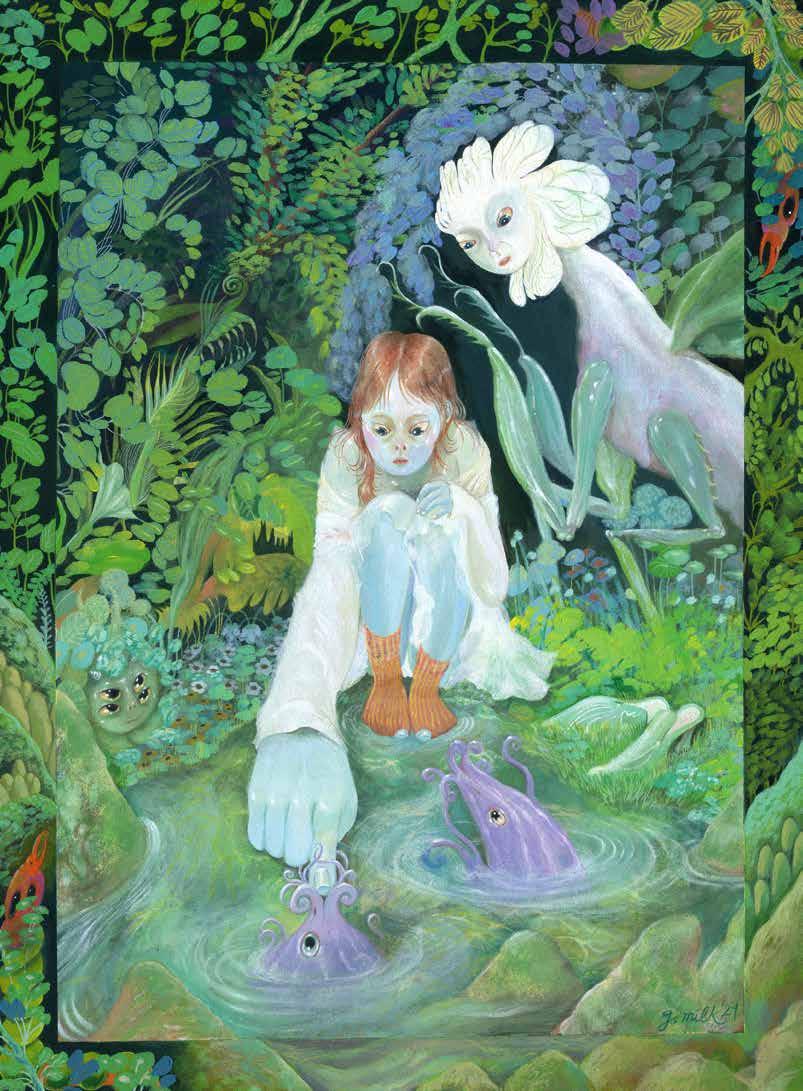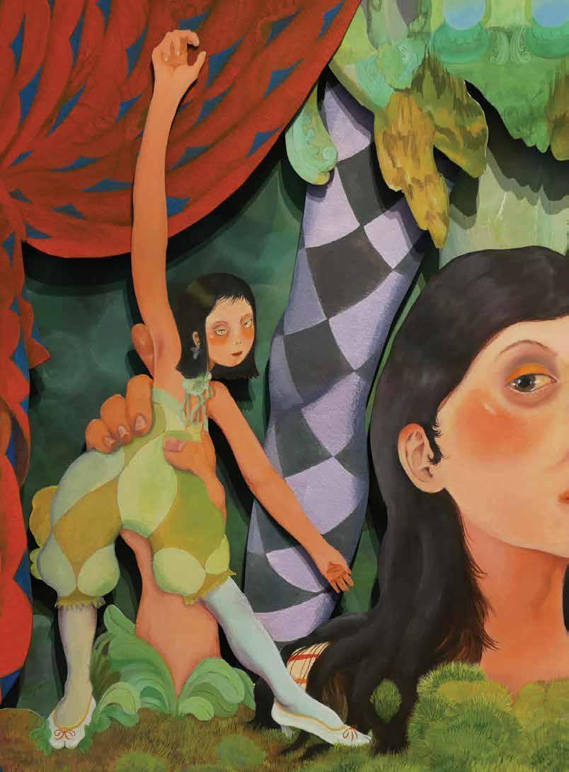 manifestation of Milk’s world. Inside, visitors encounter a self-portrait, “Welcome to the Forest Castle,” depicting herself puppeteering two young Asian women clothed in moss green and periwinkle harlequin costumes set within a shadow box frame. The show of 15 paintings and three sculptures, created between Hawaiʻi and New York City during the pandemic, traced Milk’s ongoing meditations on community, isolation, and trauma. These paintings also marked a metaphorical homecoming that bridged the fantastical and the familiar landscapes that shaped her. In “Outskirts of the Forest Castle,” a young heroine crouches beside a still pond surrounded by a verdant tangle of moss, plants, and shadowy greens. She reaches toward the parted mouth of an unearthly nishikigoi (a mythical Japanese aquatic figure), unaware of the spirits peering silently from the trees, guarding her bond with the forest.