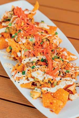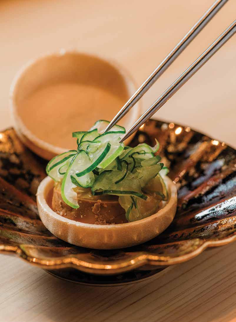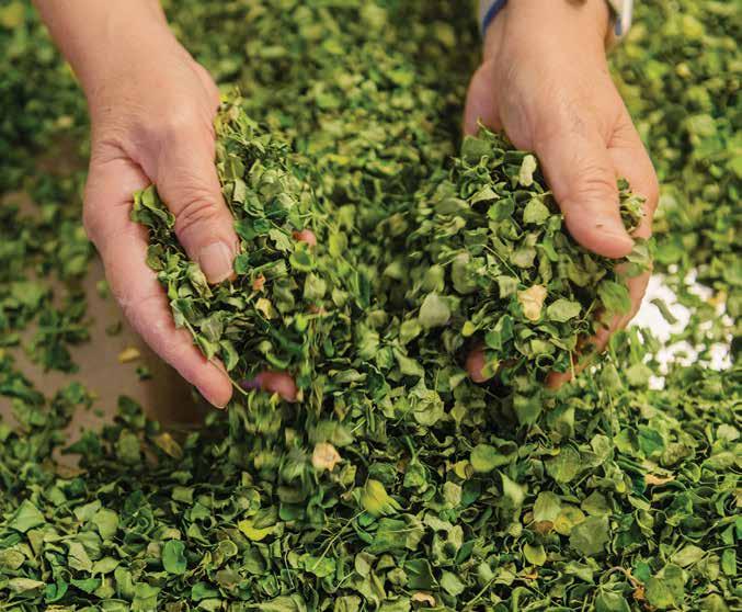 lab, where he grows and experiments with locally grown microalgae such as spirulina and chlorella, then processes them into a fine powder suitable for noodle making. The finished products, such as a high-quality, emerald-green spirulina, are then used at Aunty’s Hapa Hawaiian Foodlab in Kāneʻohe, where they are folded into batches of dough. Beyond processing microalgae for making noodles, Du’s lab acts as a research center of sorts. Alongside a team of students, he studies the nutritional value of aquatic crops grown outside the lab, such as watercress from Sumida Farm or ogo seaweed from Olakai Hawaii, the only farm to commercially grow sea asparagus in the country (an ingredient that lab has just begun testing too).