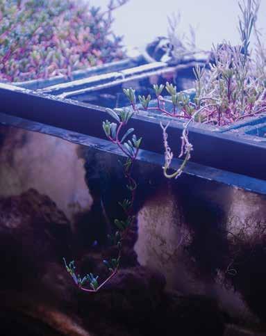 living cells and tissues with a confocal scanning laser microscope, photographing details of algae invisible to the naked eye, and 3-D printers create custom components for specialized aquaculture tanks, where sea asparagus and microalgae grow. In a temperature-controlled room, LED-lit incubators line the walls, simulating the optimal factors for yielding an abundance of aquatic crops.