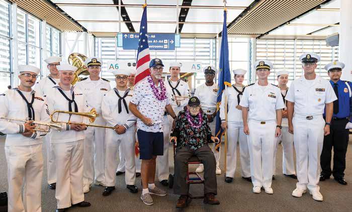 Crew members on Hawaiian’s Airbus A330 personally thanked Ike for his dedication and service to the United States and made in-flight announcements recognizing him. Once the Schab family arrived, John Kim, president of the Hawaiian Airlines Veteran Employee Network (HAVEN), greeted them at their seats and escorted them to the gate. Waiting outside the jet bridge was the US Navy honor guard and live music by the US Pacific Fleet Band—the same ensemble Ike once played with as a tubist.