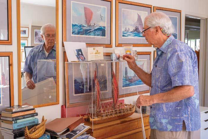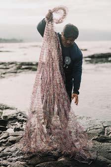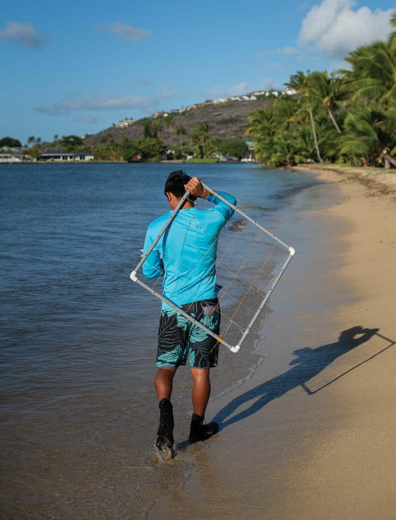 Back in the day, Hawaiians made their own nets from cordage, which they also made. But modernity rendered the tedious, painstaking craft obsolete and it, like so many traditional arts, is dying. Apo is one of only a few Native weavers left. Growing up in a large Kona family, young Apo had to help feed the ‘ohana, so his father and uncles taught him to weave ‘upena, as much out of necessity as passing on tradition. “I’ve been fishing the Kona Coast my whole life, mostly with monofilament nets like this,” says Apo, pointing to a rainbowhued kiloi ‘upena (throwing net) in