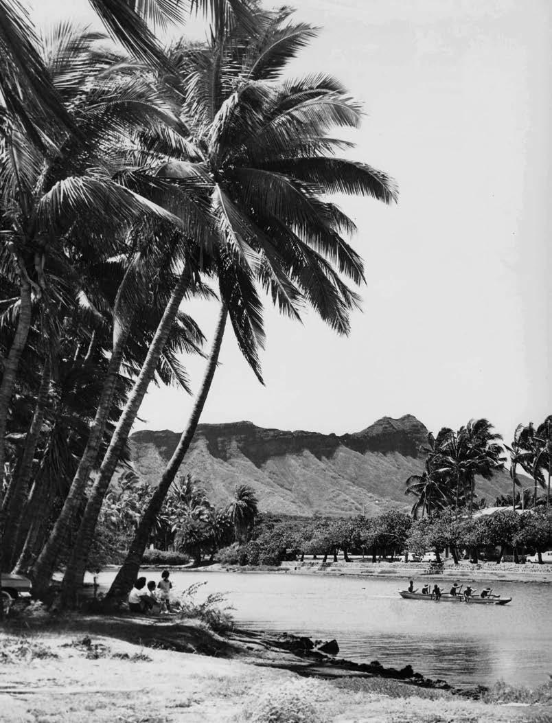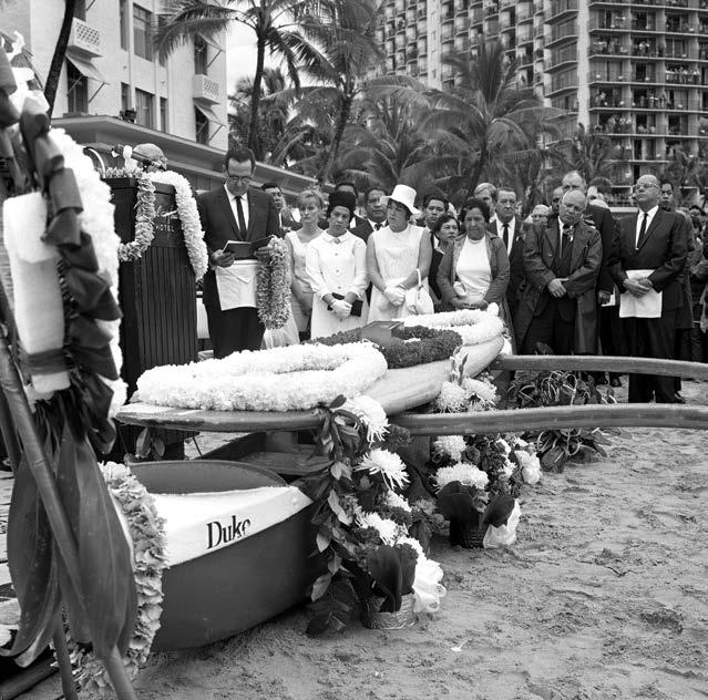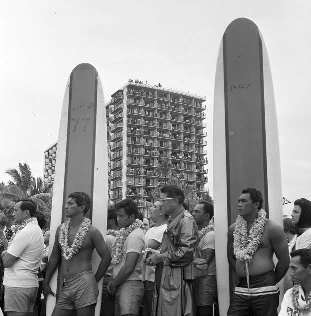 Regatta Day was big in the 1800s. Established by King Kalākaua to celebrate his birthday, every manner of vessel would race—rowing shells, whaleboats, Japanese sampans, sailing canoes, twelve-oared racing cutters and, of course, Hawaiian outrigger canoes— with some ten thousand spectators at Honolulu Harbor cheering on their teams. Competitive spirit was high— wagering on heihei wa‘a (canoe racing) was customary—and the two top teams at the turn of the twentieth century were Honolulu’s Outrigger Canoe Club and an all-Kānaka Maoli (Native Hawaiian) crew from Kailua-Kona, Hawai‘i Island. In 1901, Prince Jonah Kūhio
