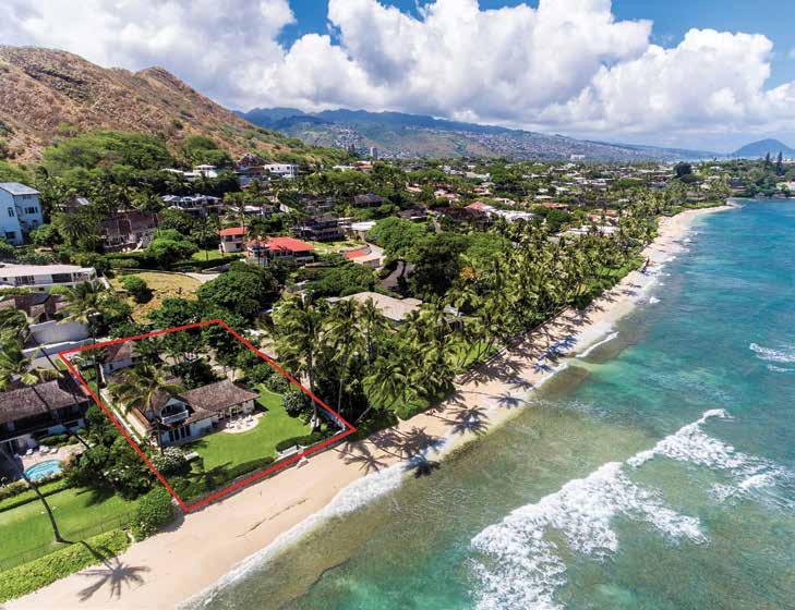 This beachfront Diamond Head retreat features more than 85 linear feet of gorgeous sandy beach. A beautiful home thoughtfully rebuilt in 2004 had maintained the spirit and charm of a classic Hawaii home with traditional batten board siding, hardwood flooring, crown moldings and walls of pocketing glass doors to enjoy gorgeous ocean and garden views from the living and dining areas. A generous second floor master suite boasts vaulted ceilings, an ocean-facing covered lanai, and walk-in closet with numerous built-ins. The entry to the property is impressively walled for privacy and the interior showcases exceptional attention and design details throughout.