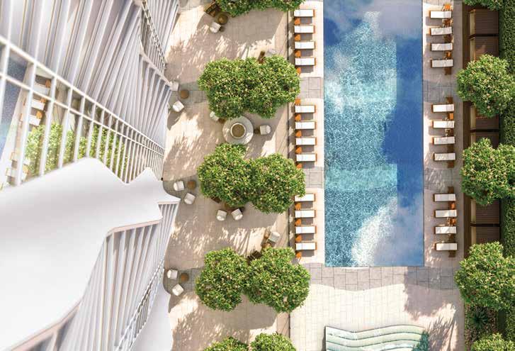 with kitchens and dining areas, lounges that open onto the pool deck, shaded cabanas—places that invite sharing stories and laughter. From the pool, the view down to the 1.5-acre park suggests another important relationship, one with the natural world. Pedestrian pathways meander through gardens, and spaces where the community can gather to do yoga, connecting points where casual encounters will lead to conversations and newfound friendships will form.