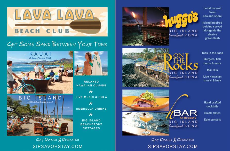 Whether you are exploring the beauty of Kaua‘i or the beaches of the Big Island, Lava Lava Beach Club sets new standards for island-inspired cuisine and creative cocktails, served up with a toes-in-the-sand ambiance. Its flagship location on Anaeho‘omalu Bay is at the legendary Waikoloa Beach Resort on Big Island, while its newest beachfront restaurant is located at Kauai Shores, an Aqua Hotel, in Kapa‘a, on the Coconut Coast of Kaua‘i. Locals and visitors love both beachfront destinations, where guests can dine, drink, celebrate, or simply relax in laidback Hawaiian-style luxury. Named World’s Best Beach Bars, Top 100 Best Al Fresco Dining in America, and Top Beach Wedding Venue, gay-owned-and-operated Lava Lava Beach Club is the place to be for romantic dinners or fun gatherings with friends and family. Whether you’re looking to nibble and nosh, sip and savor, or party and celebrate, Lava Lava Beach Club is the perfect beachfront dining experience. Lava Lava Beach Club Kaua‘i is located at 420 Papaloa Rd. and Lava Lava Beach Club Waikoloa on Big Island is located at 69-1081 Kuualii Pl. For more information, visit lavalavabeachclub.com.