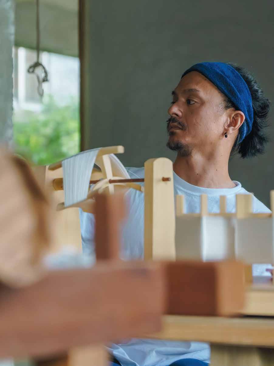 沖縄本島の西海岸、東シナ海を臨む本部町にある家族のアトリ エで、真栄城興和は織機に向かっていた。とりわけ湿度が⾼いこ とで知られる本部町地区は、琉球藍染の原料となる藍の産地で ある。