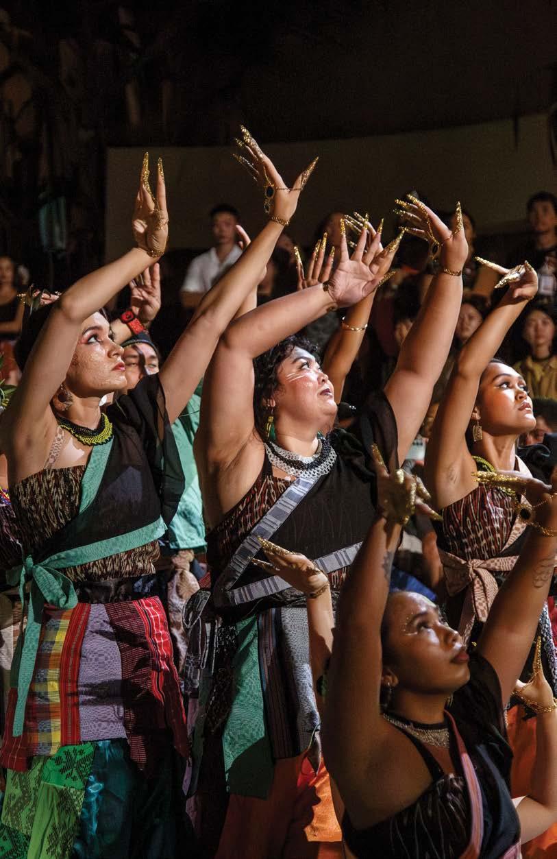 Under warm stage lights, the musicians formed a half-circle, gongs and drums arranged like ritual objects. Mallets struck with precision, coaxing shimmering overtones that rippled into deep, grounding pulses. Bright gongs rung; low drums settled into a shared heartbeat. In the center, Pangalay dancers moved with sinuous grace, fans flicking, janggay-clad fingers tracing the air in fluid arcs. Players and dancers leaned into one another as synchronized storytellers while the audience swayed, caught in the collective pulse.